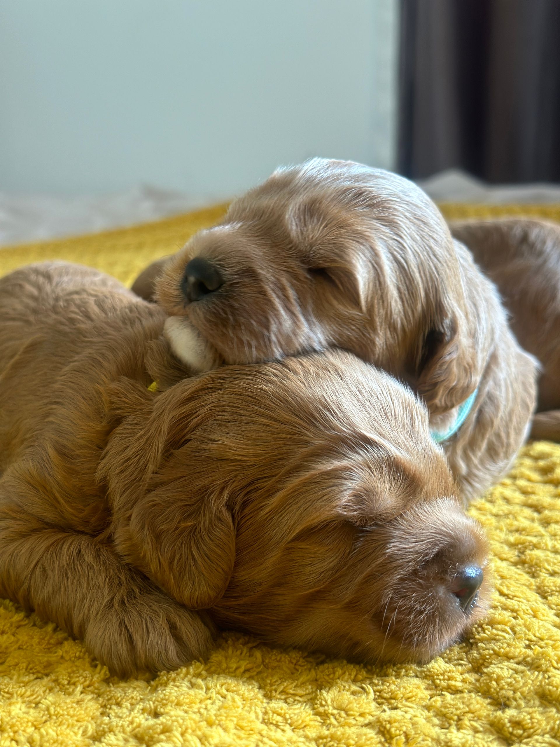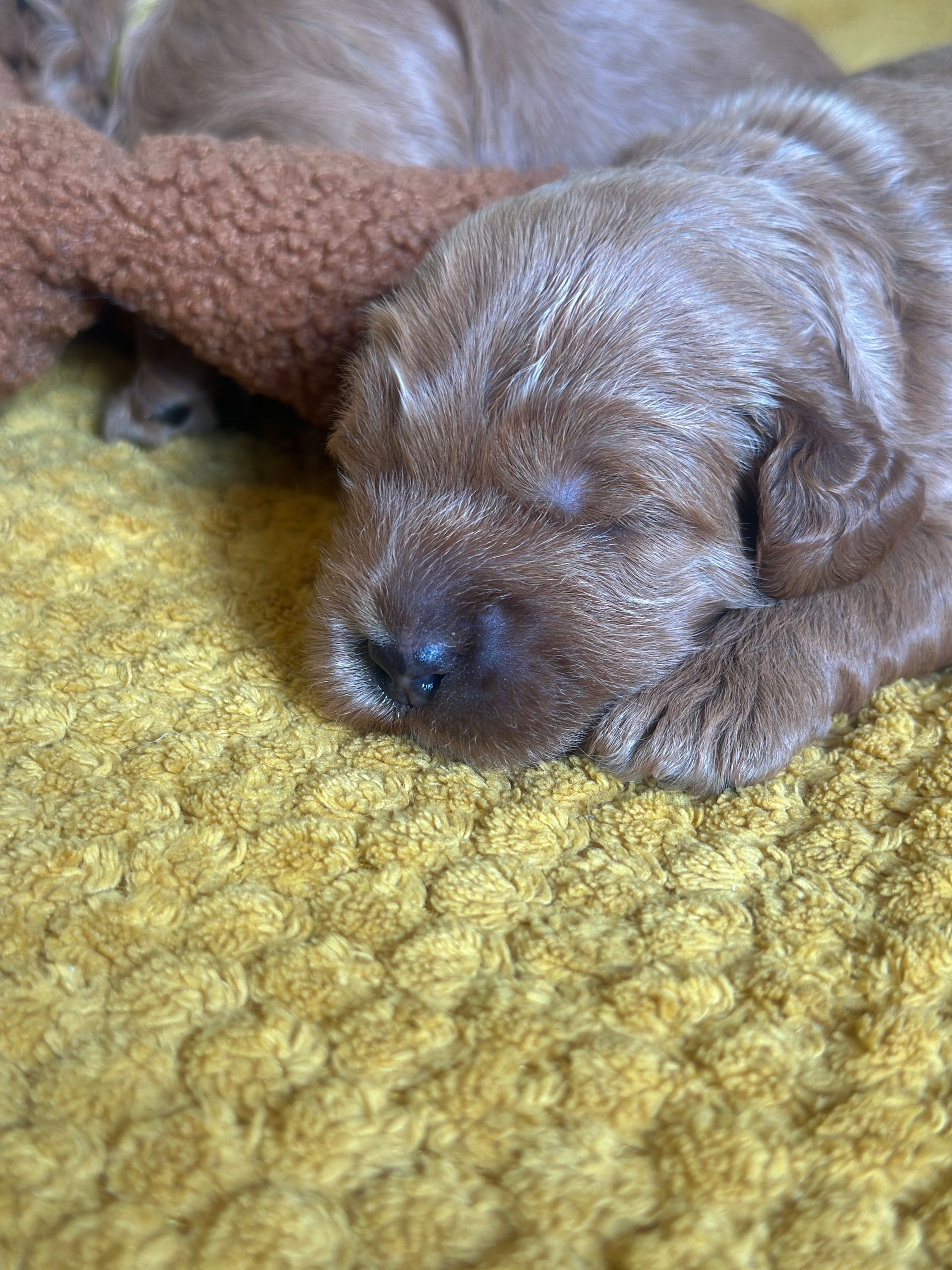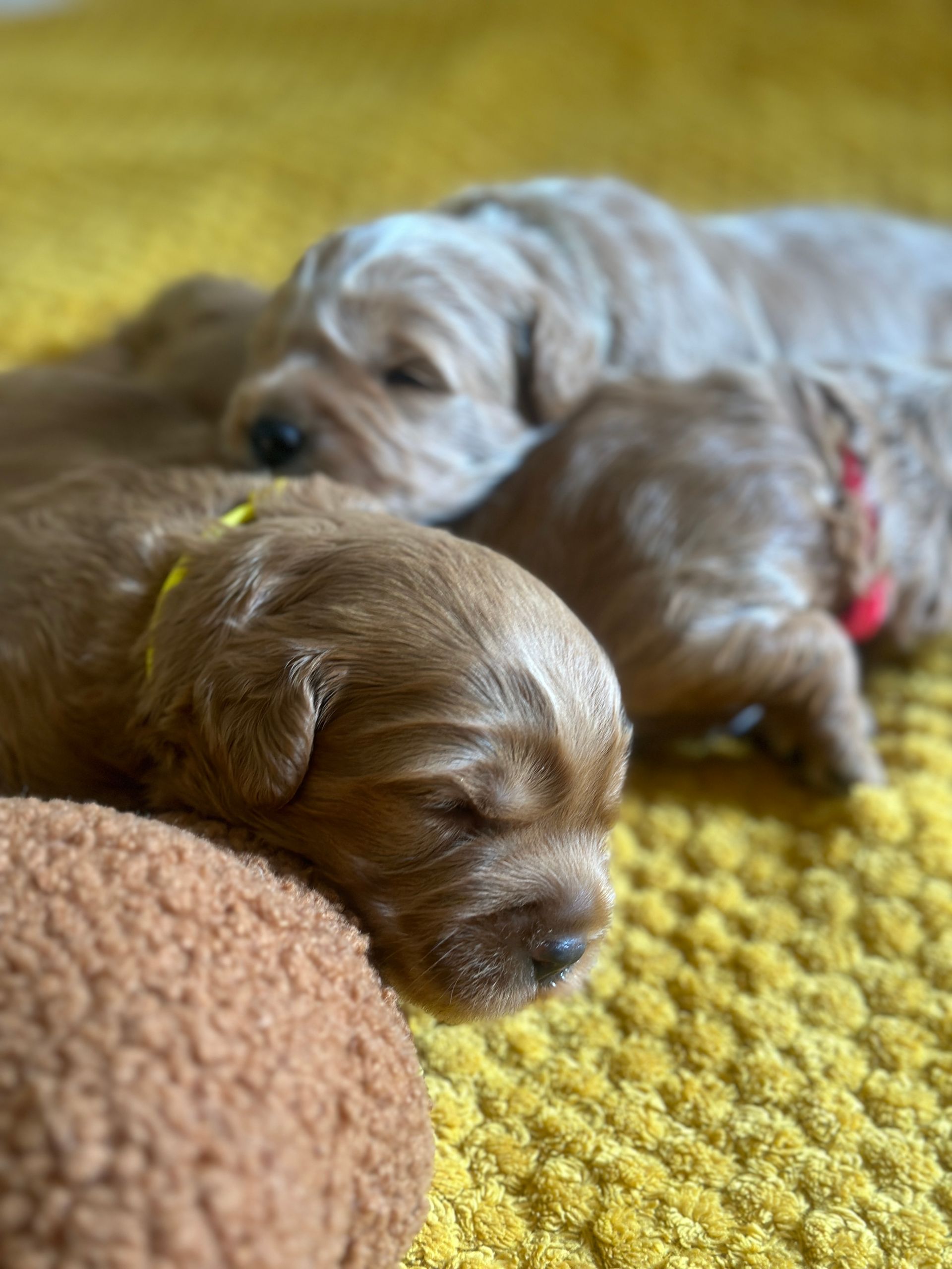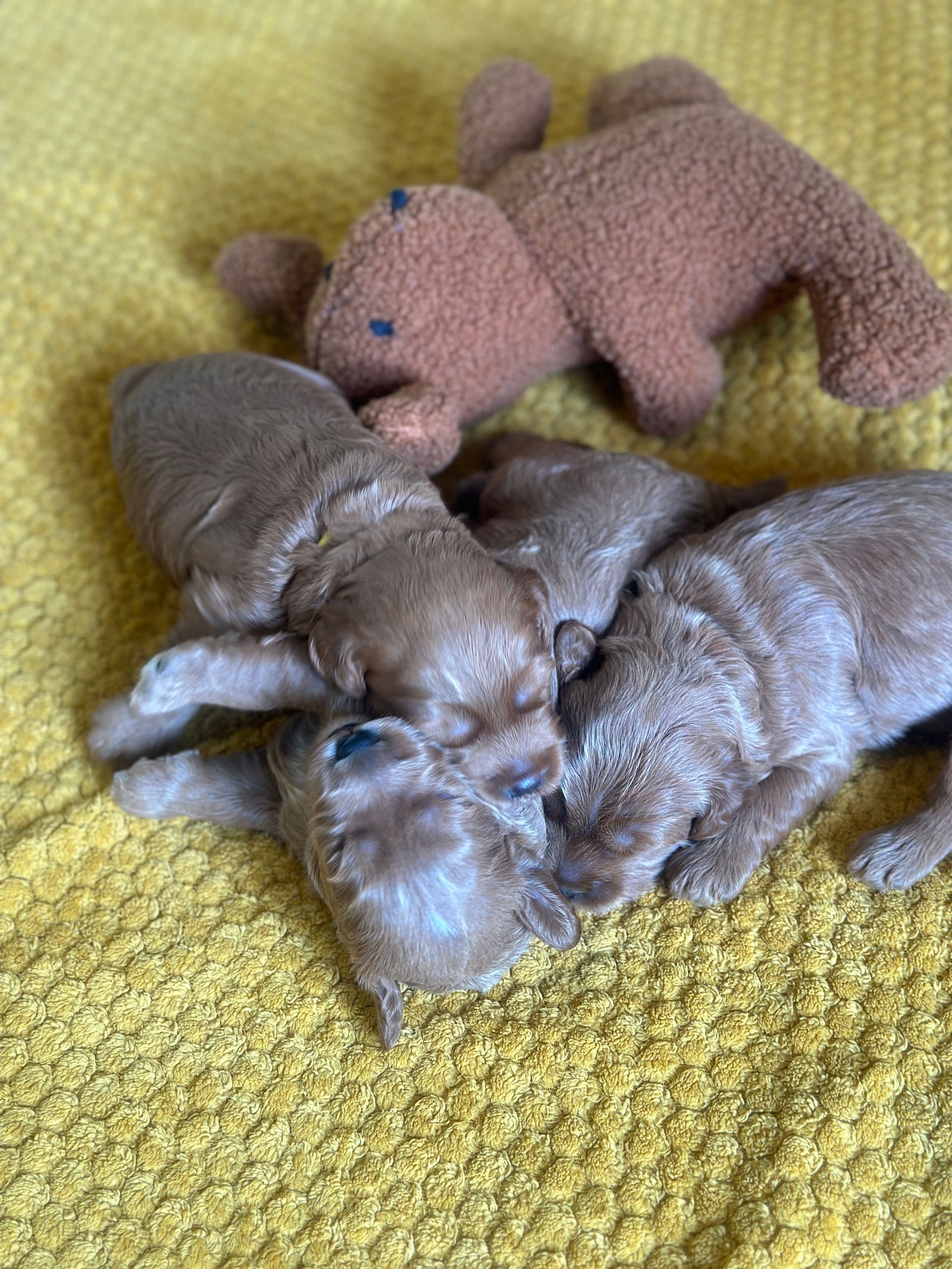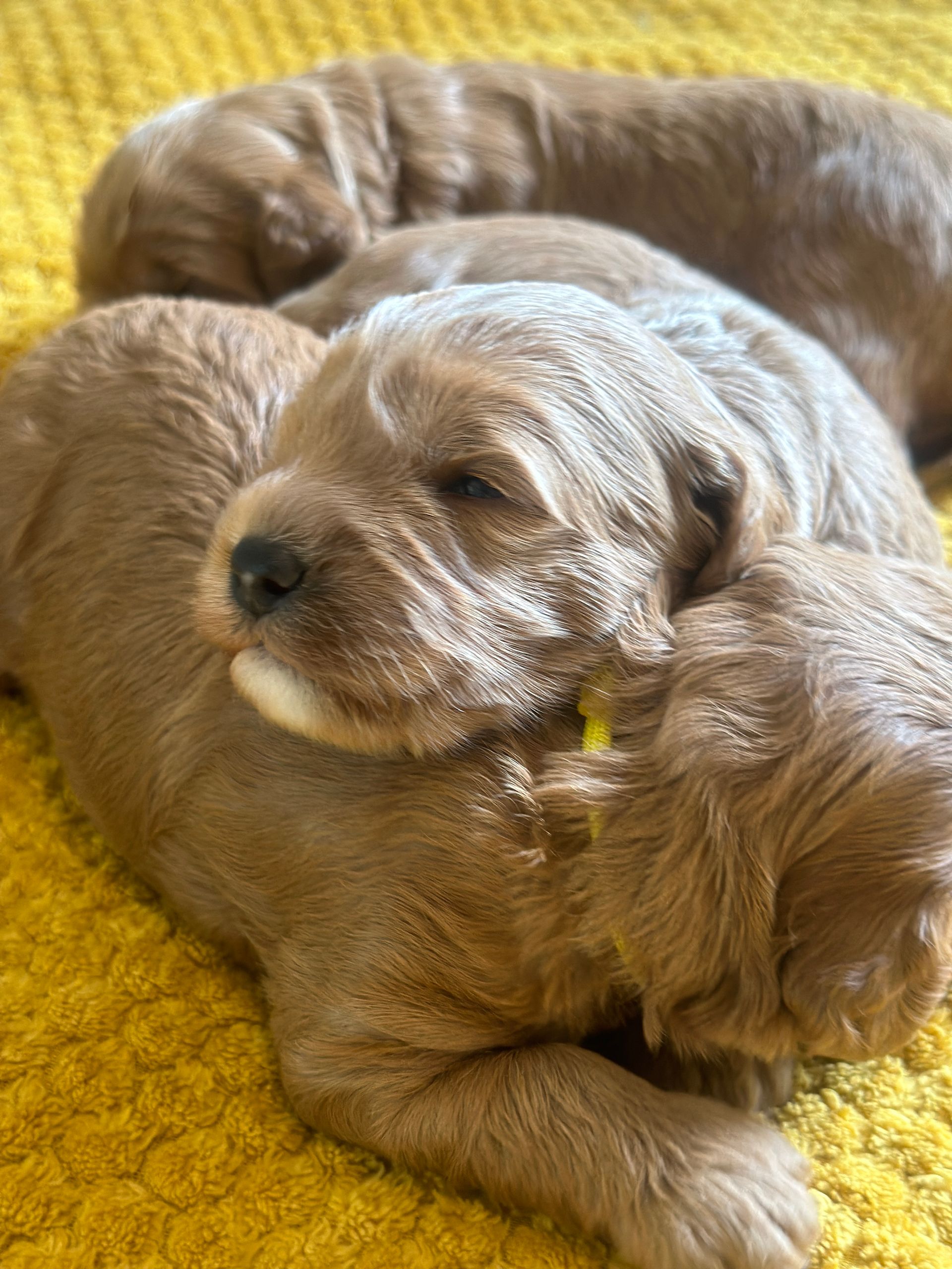 Mummy and babies are doing very well. Pups will be due for new homes around the 12th/13th December. We have caramel and creme caramel. We anticipate pups to be around 12 kg as adults dogs. All pups from this litter have loving homes to go to.