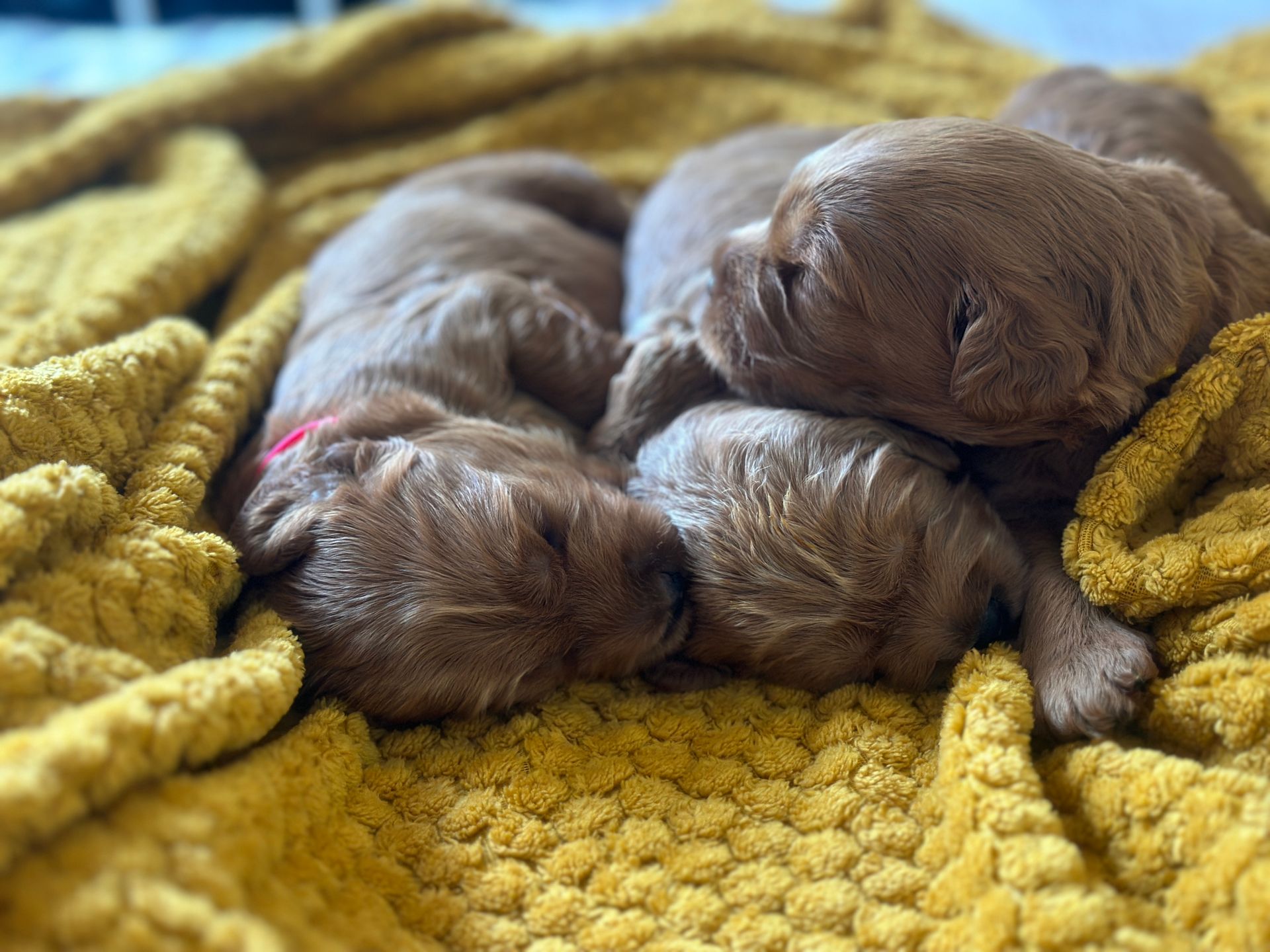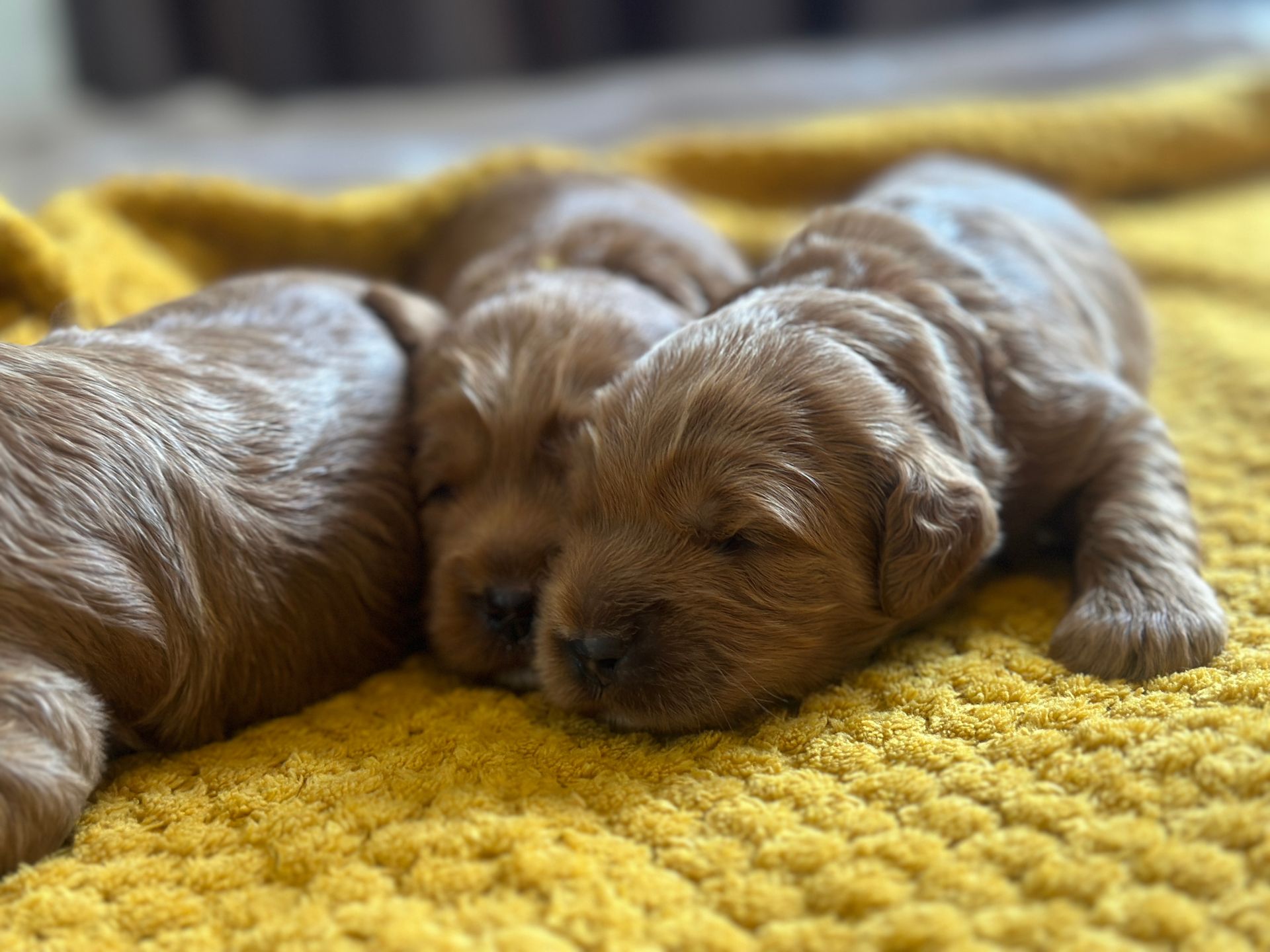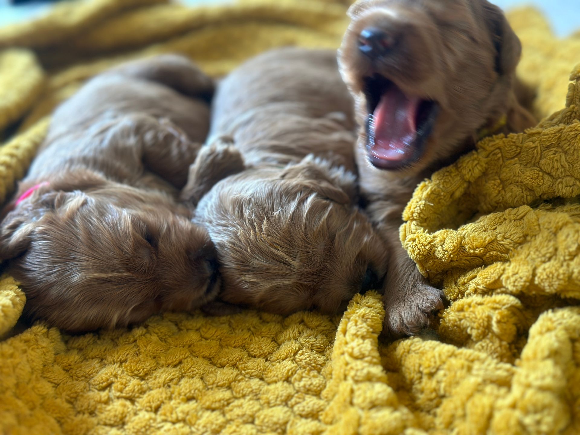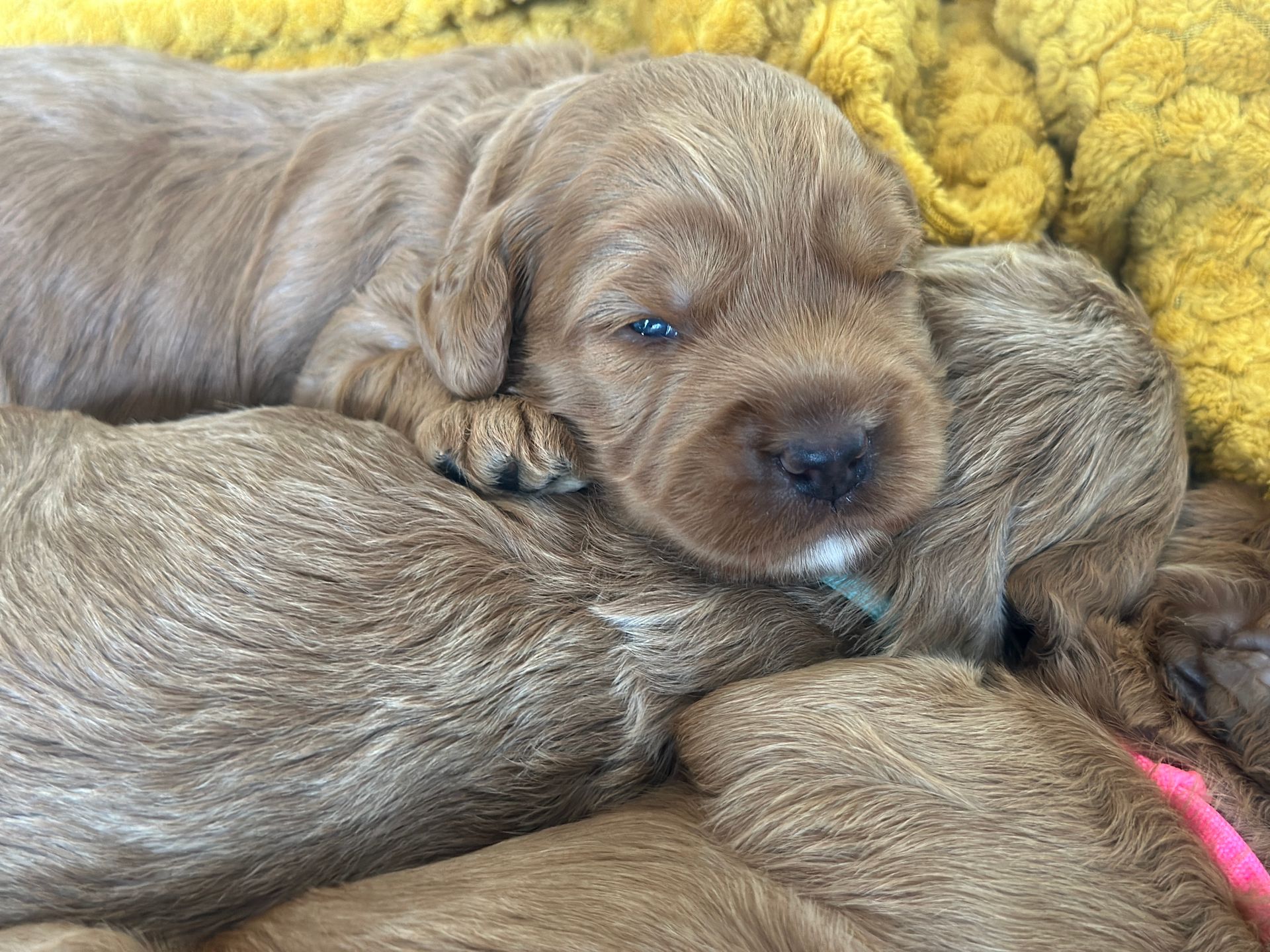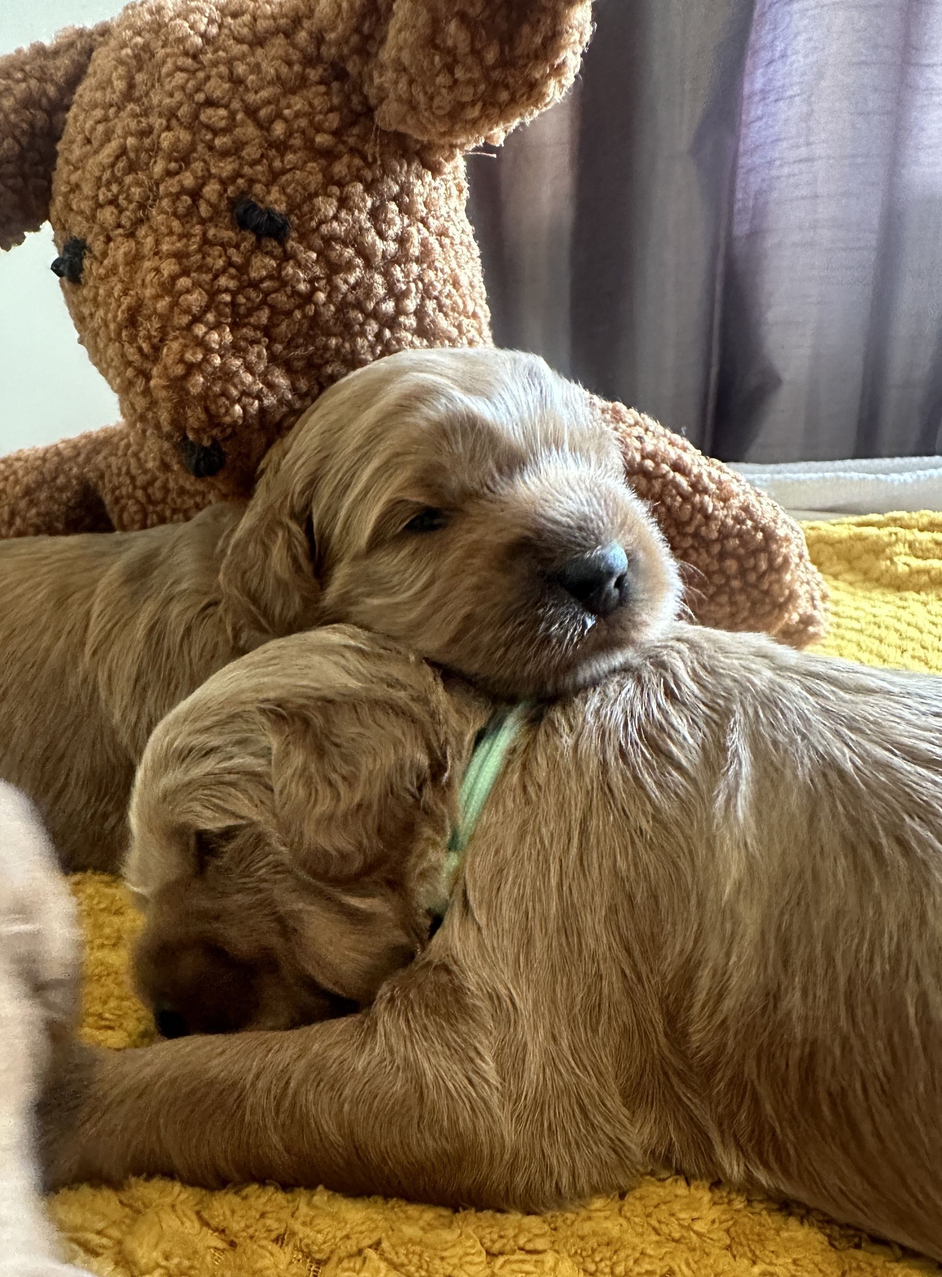 Mummy and babies are doing very well. Pups will be due for new homes around the 12th/13th December. We have caramel and creme caramel. We anticipate pups to be around 12 kg as adults dogs. All pups from this litter have loving homes to go to.