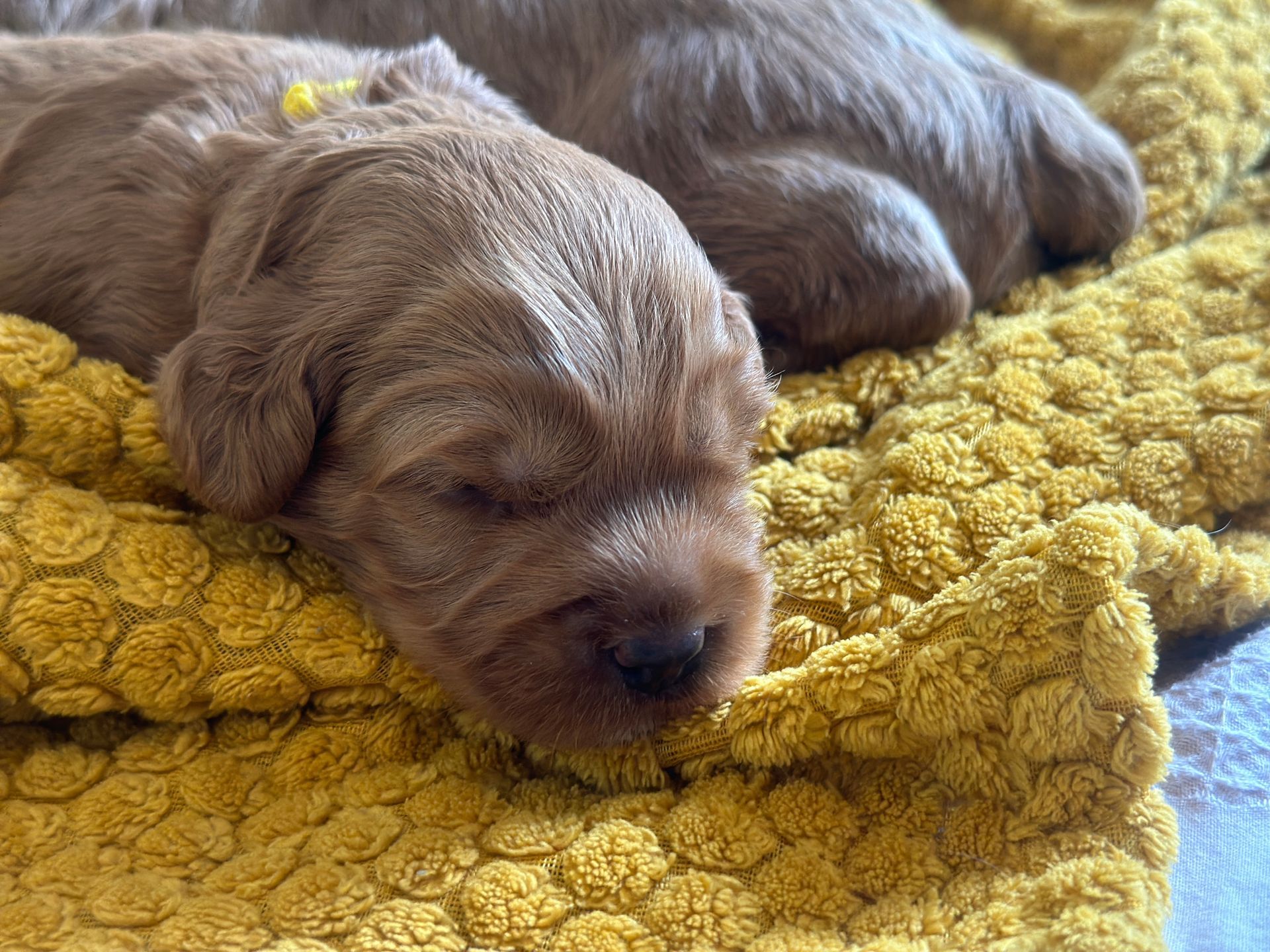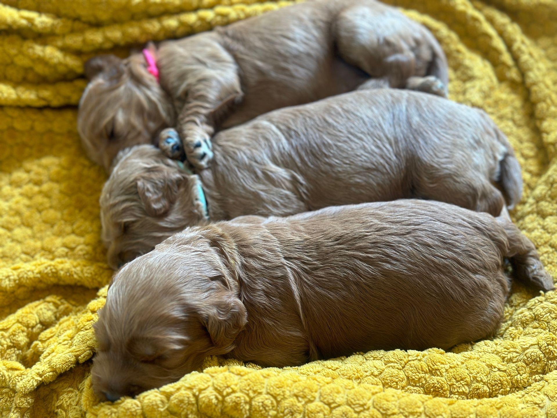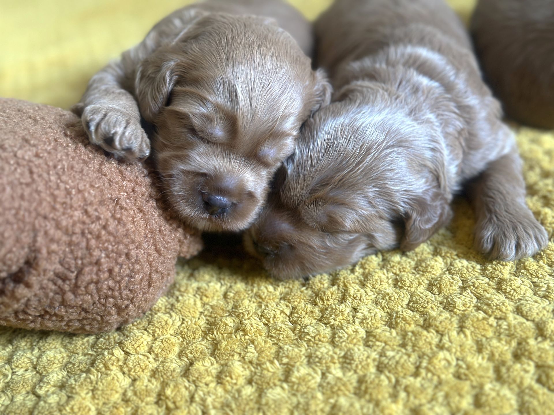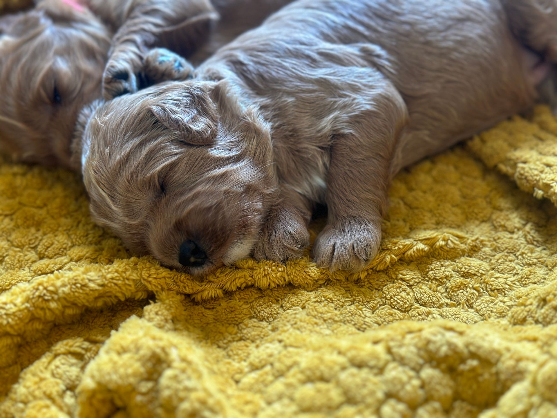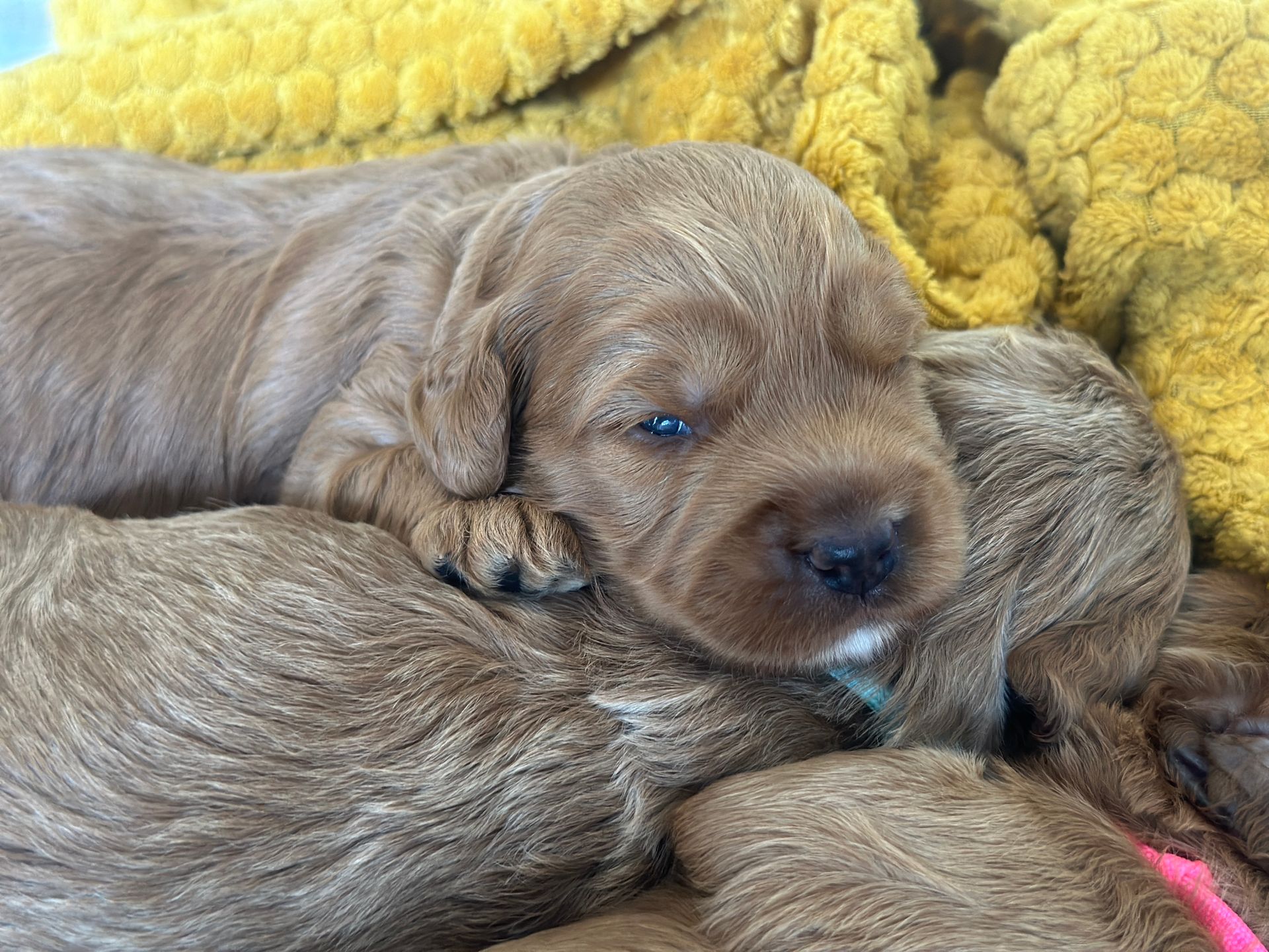 Mummy and babies are doing very well. Pups will be due for new homes around the 12th/13th December. We have caramel and creme caramel. We anticipate pups to be around 12 kg as adults dogs. All pups from this litter have loving homes to go to.