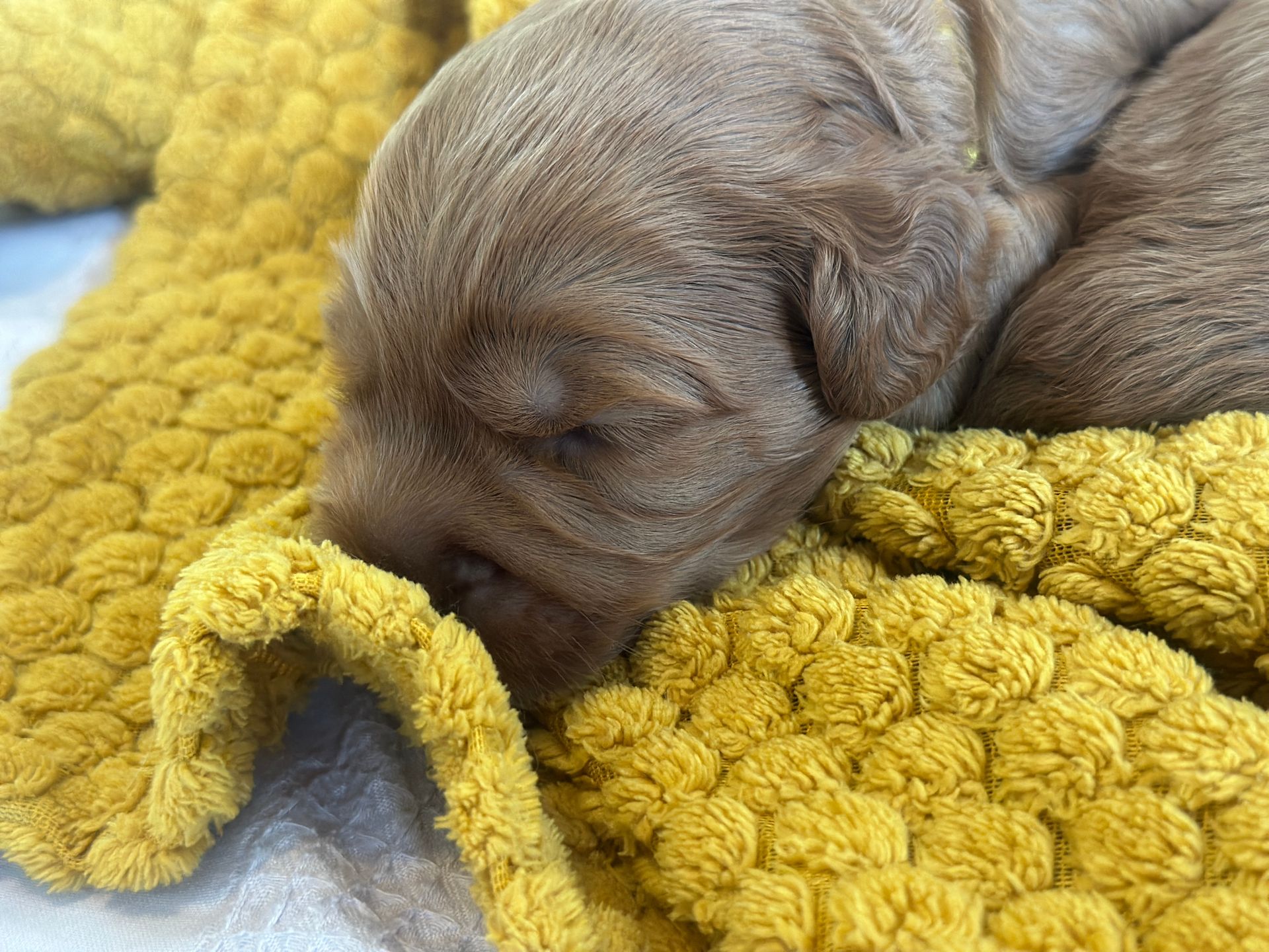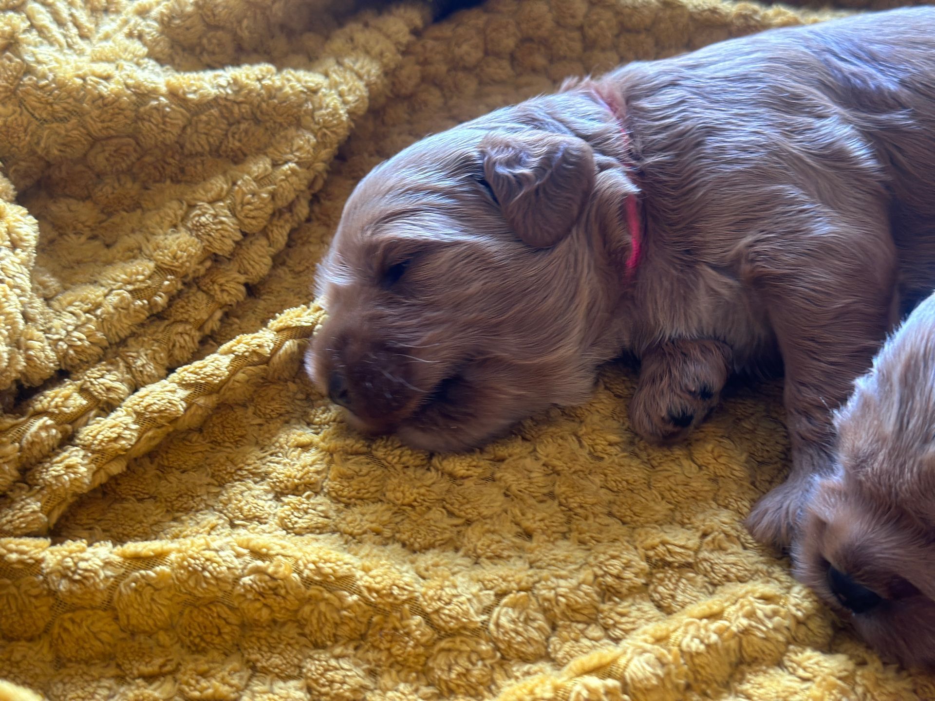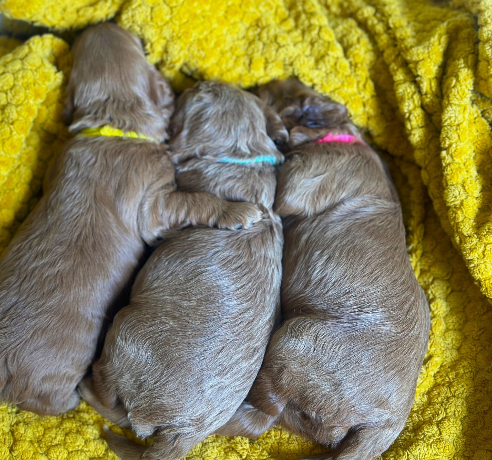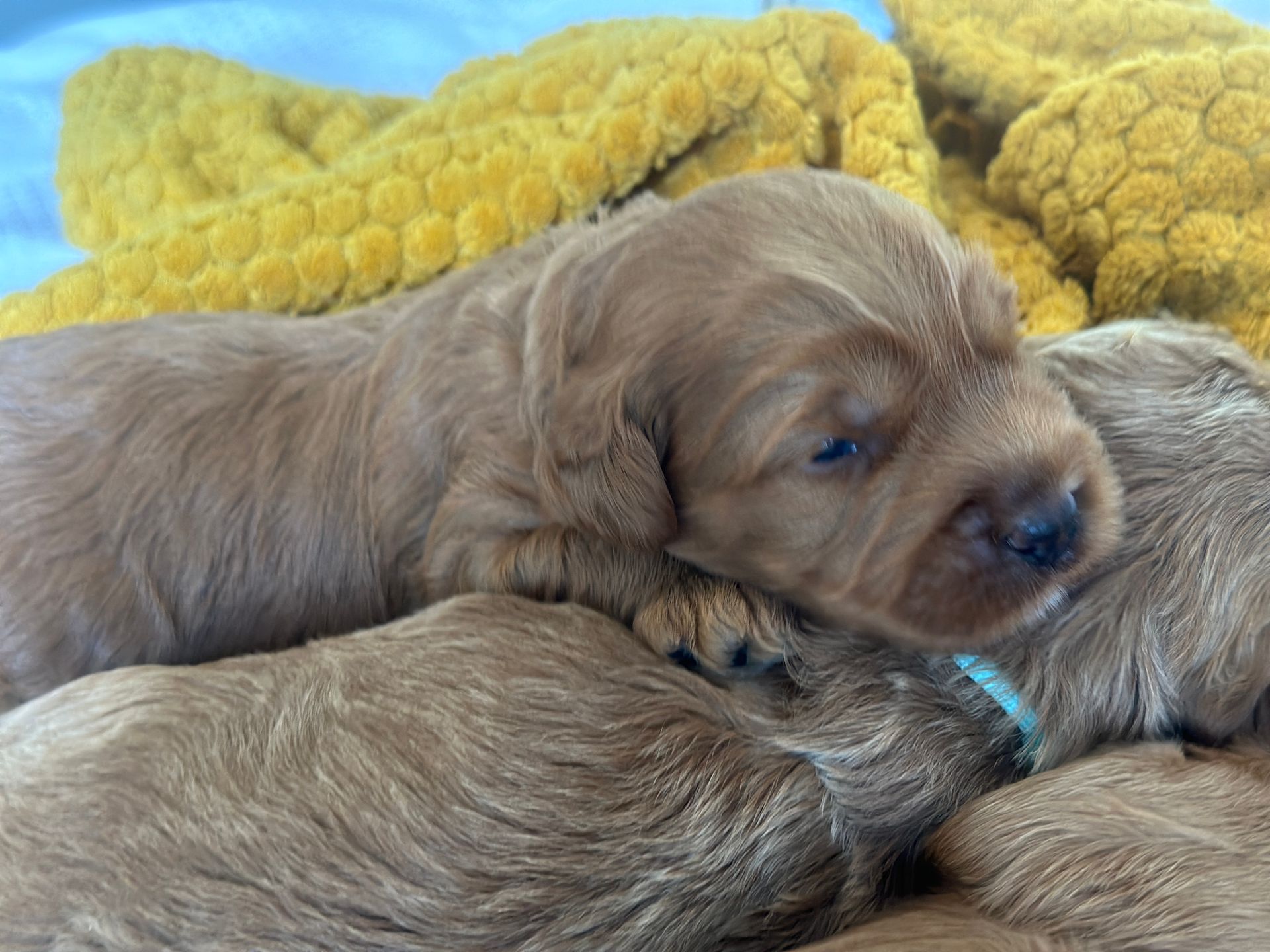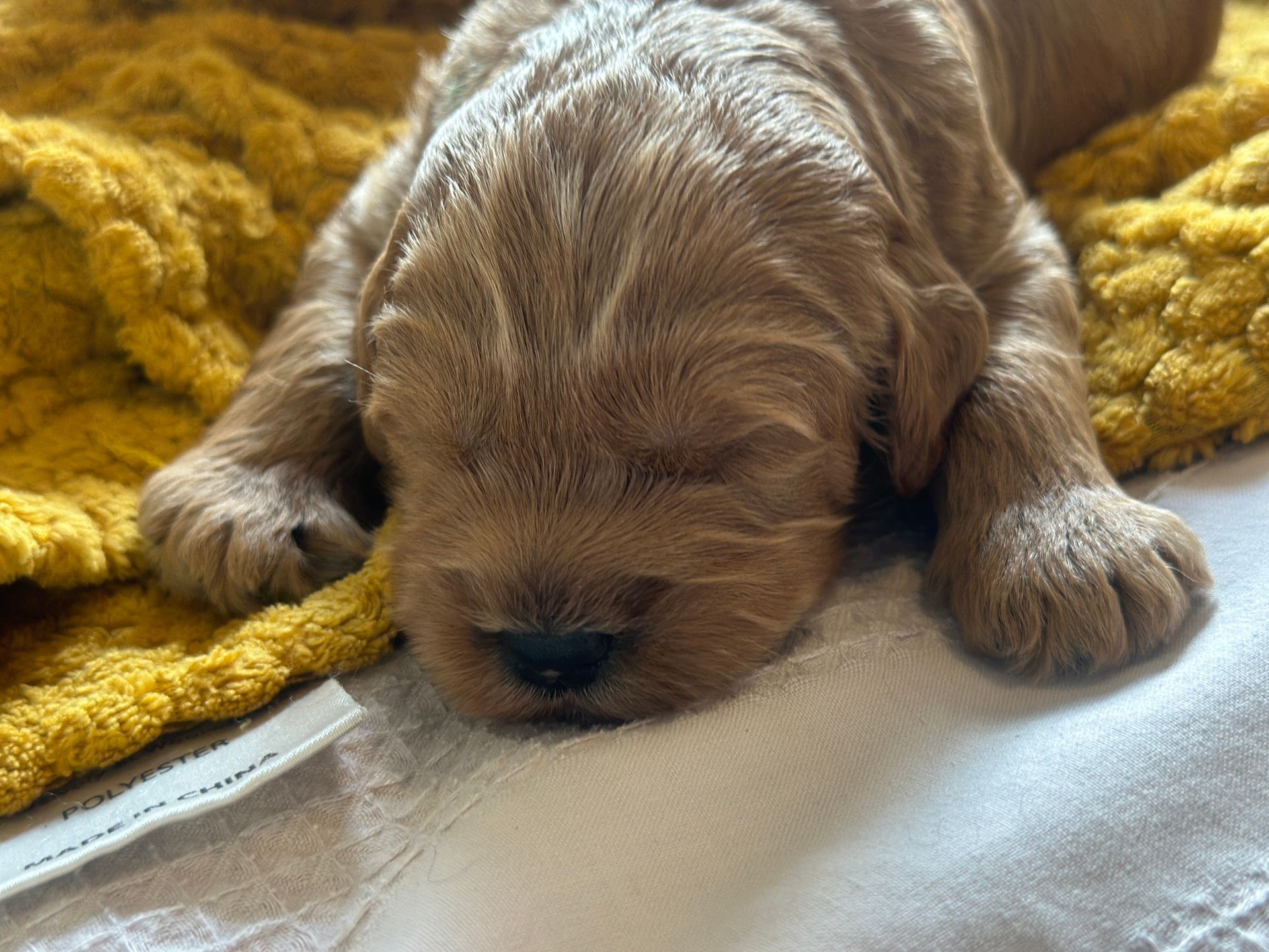 Mummy and babies are doing very well. Pups will be due for new homes around the 12th/13th December. We have caramel and creme caramel. We anticipate pups to be around 12 kg as adults dogs. All pups from this litter have loving homes to go to.