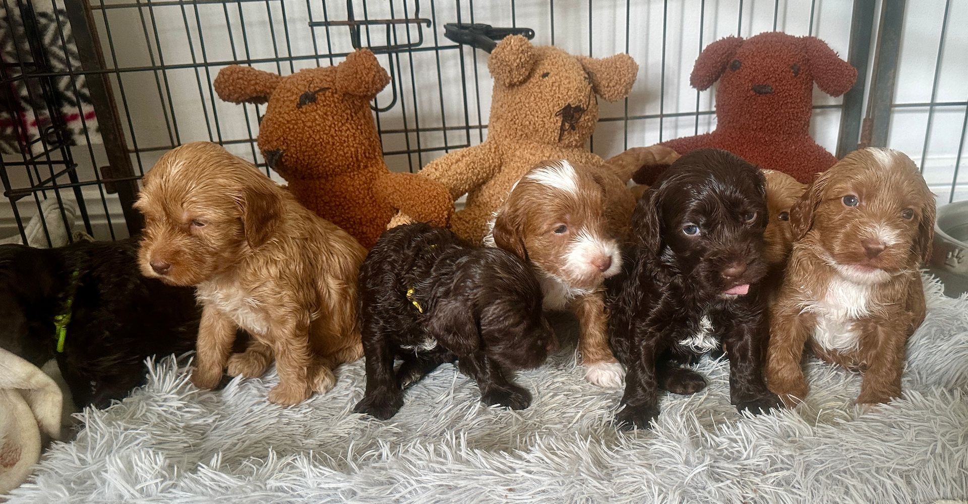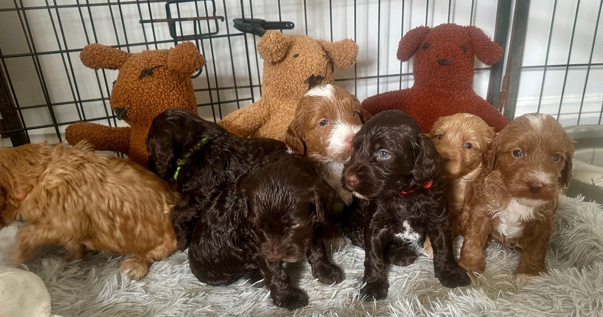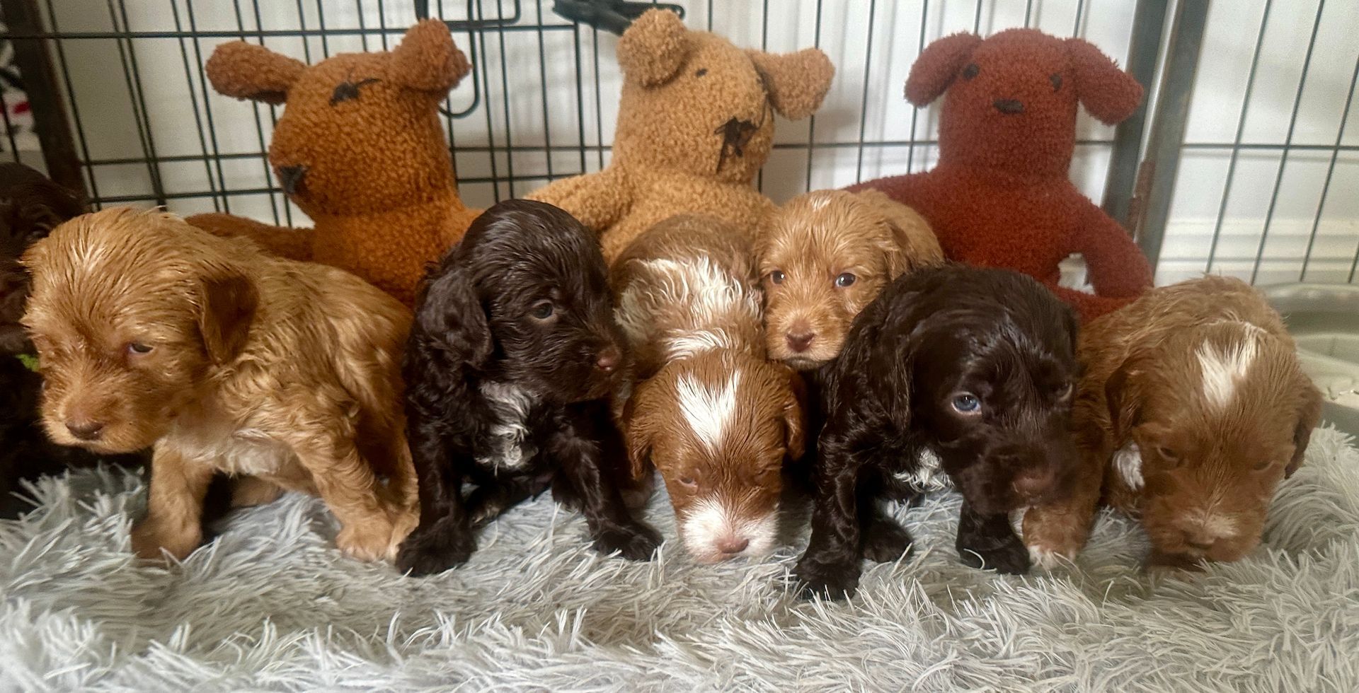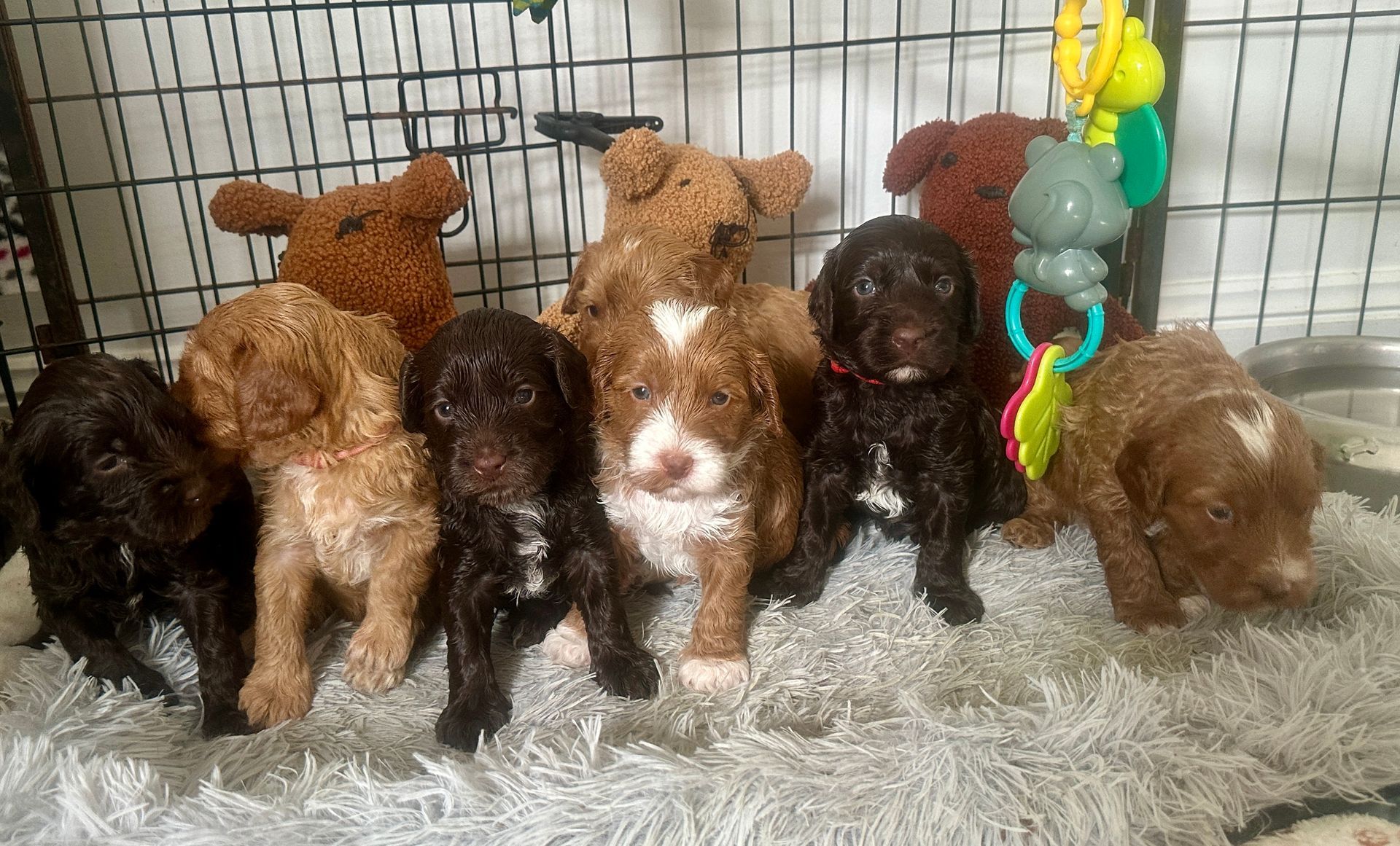 Mummy and babies are doing very well. Pups will be due for new homes around the 30th August We have 1 female and 7 males in chocolate and caramel. Puppies have beautiful soft fleece coats. Both Elise and Max have sound temperaments. We anticipate pups to be around 16 kg as adults dogs.