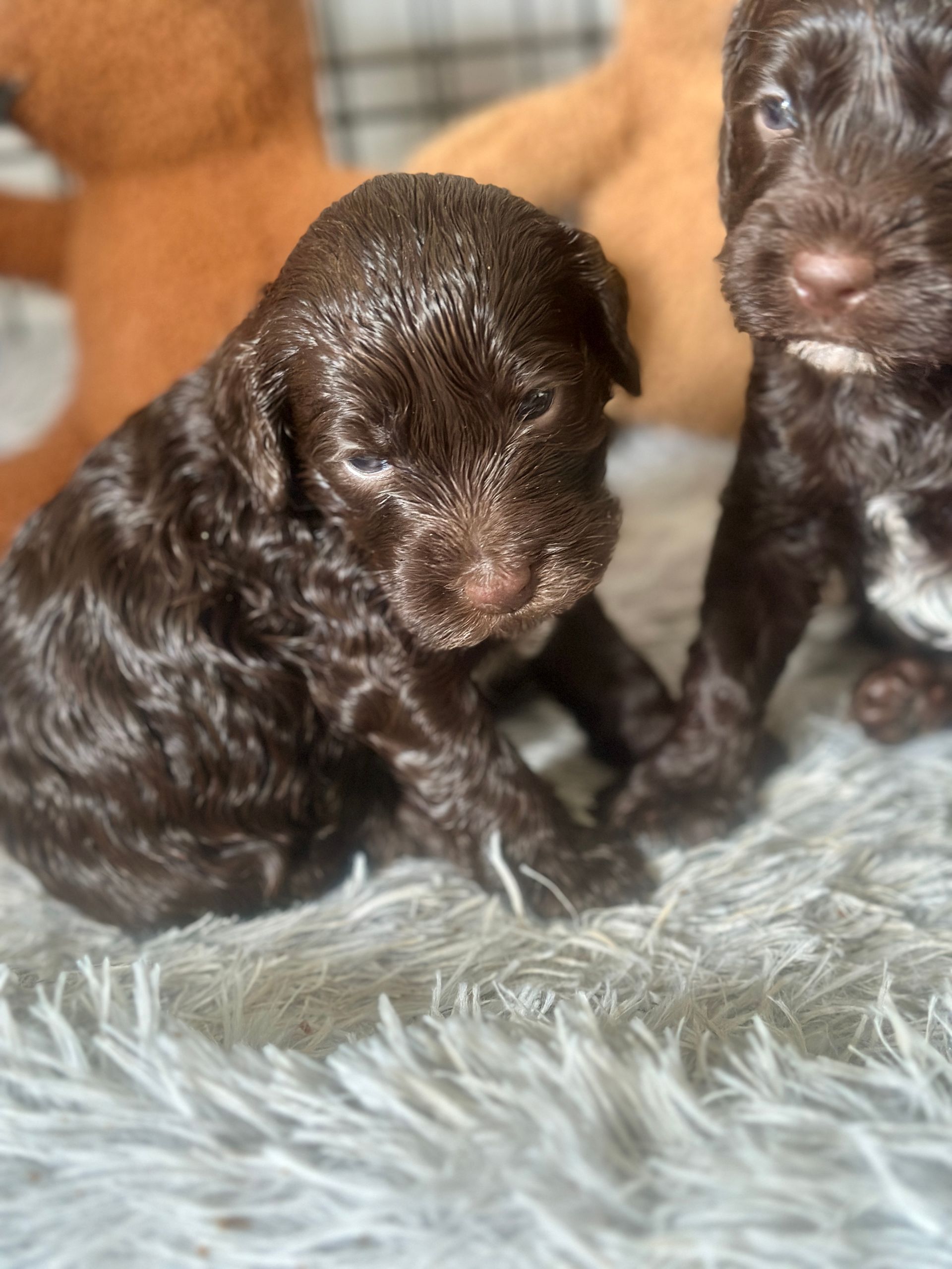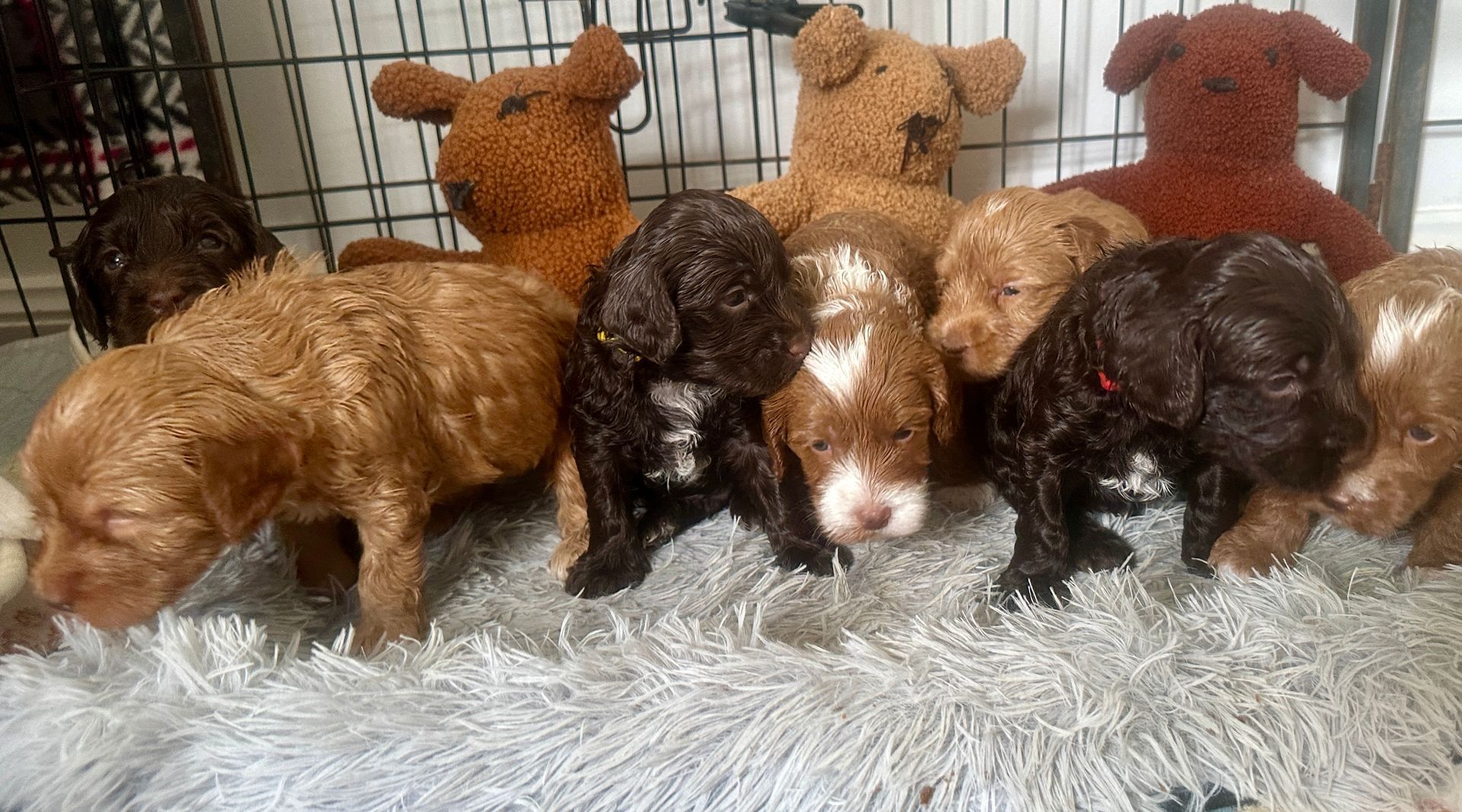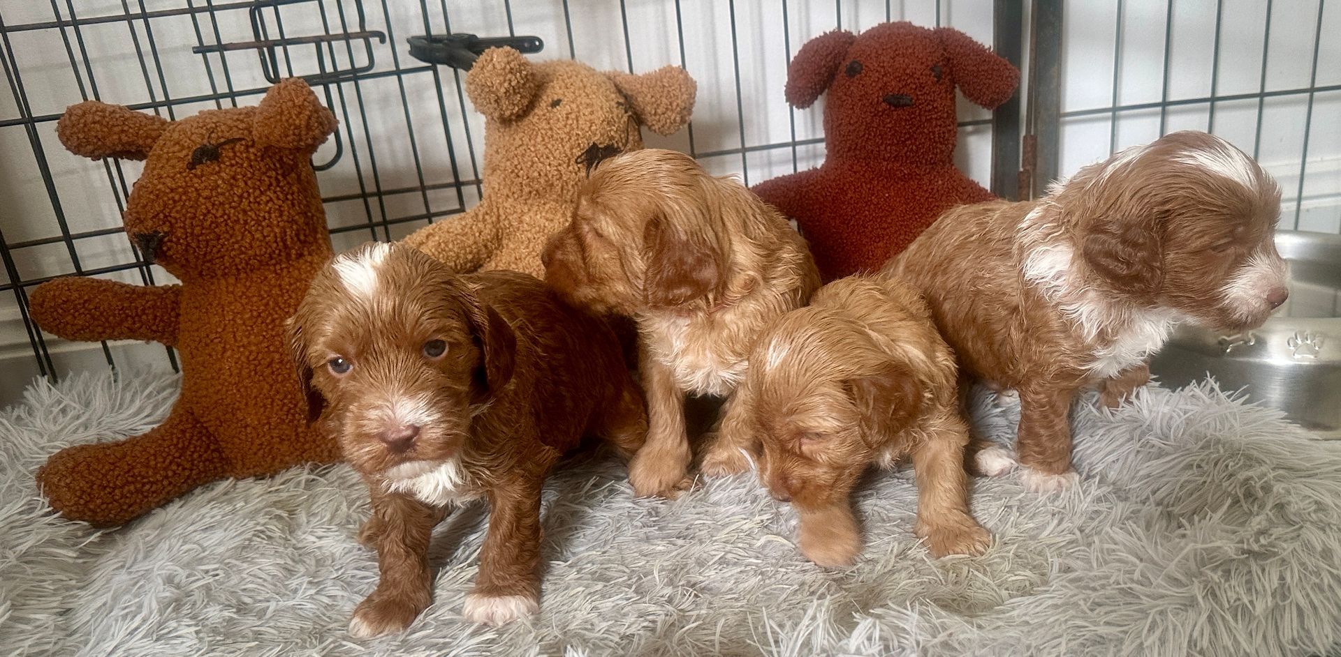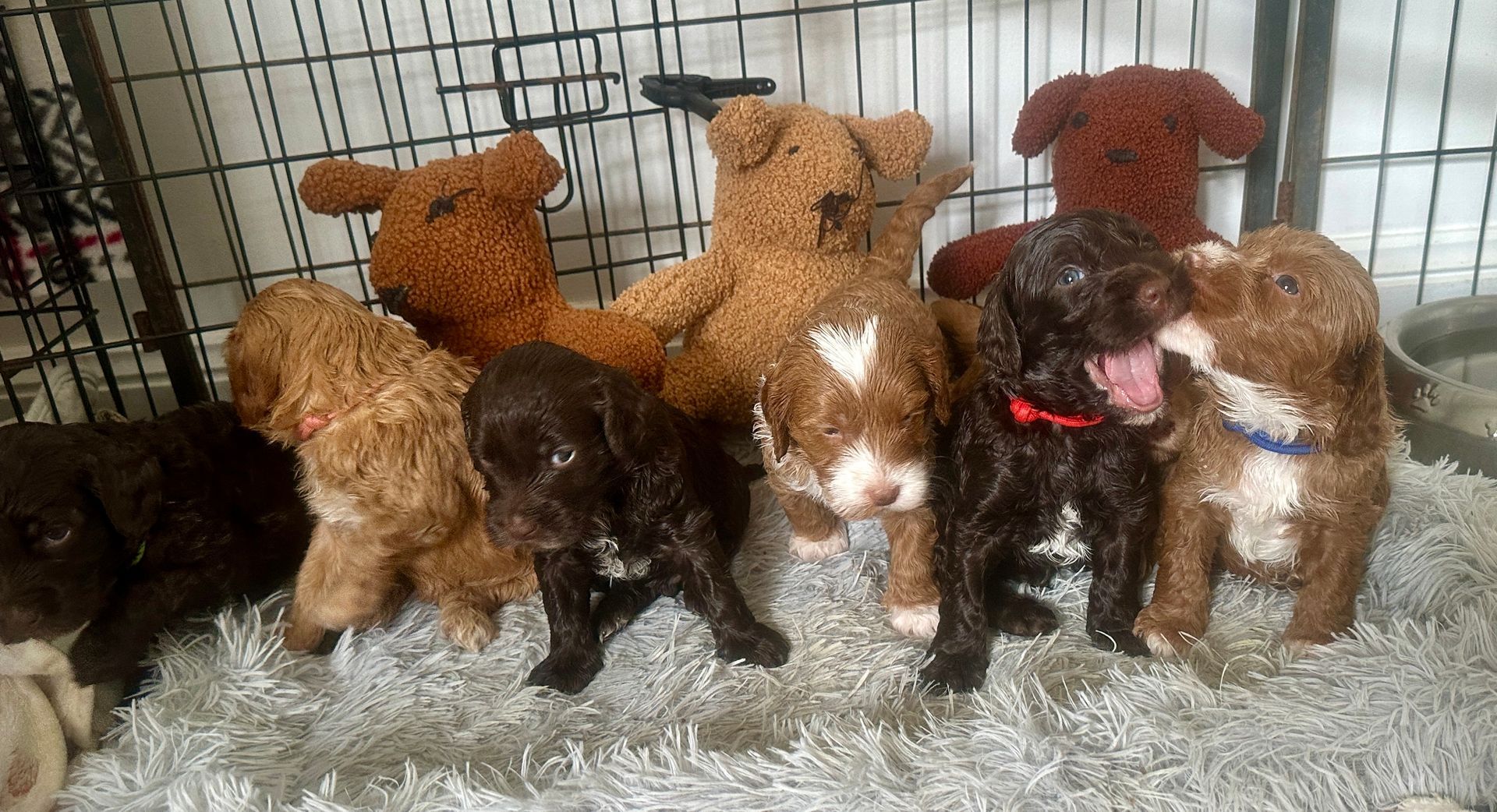 Mummy and babies are doing very well. Pups will be due for new homes around the 30th August We have 1 female and 7 males in chocolate and caramel. Puppies have beautiful soft fleece coats. Both Elise and Max have sound temperaments. We anticipate pups to be around 16 kg as adults dogs.
