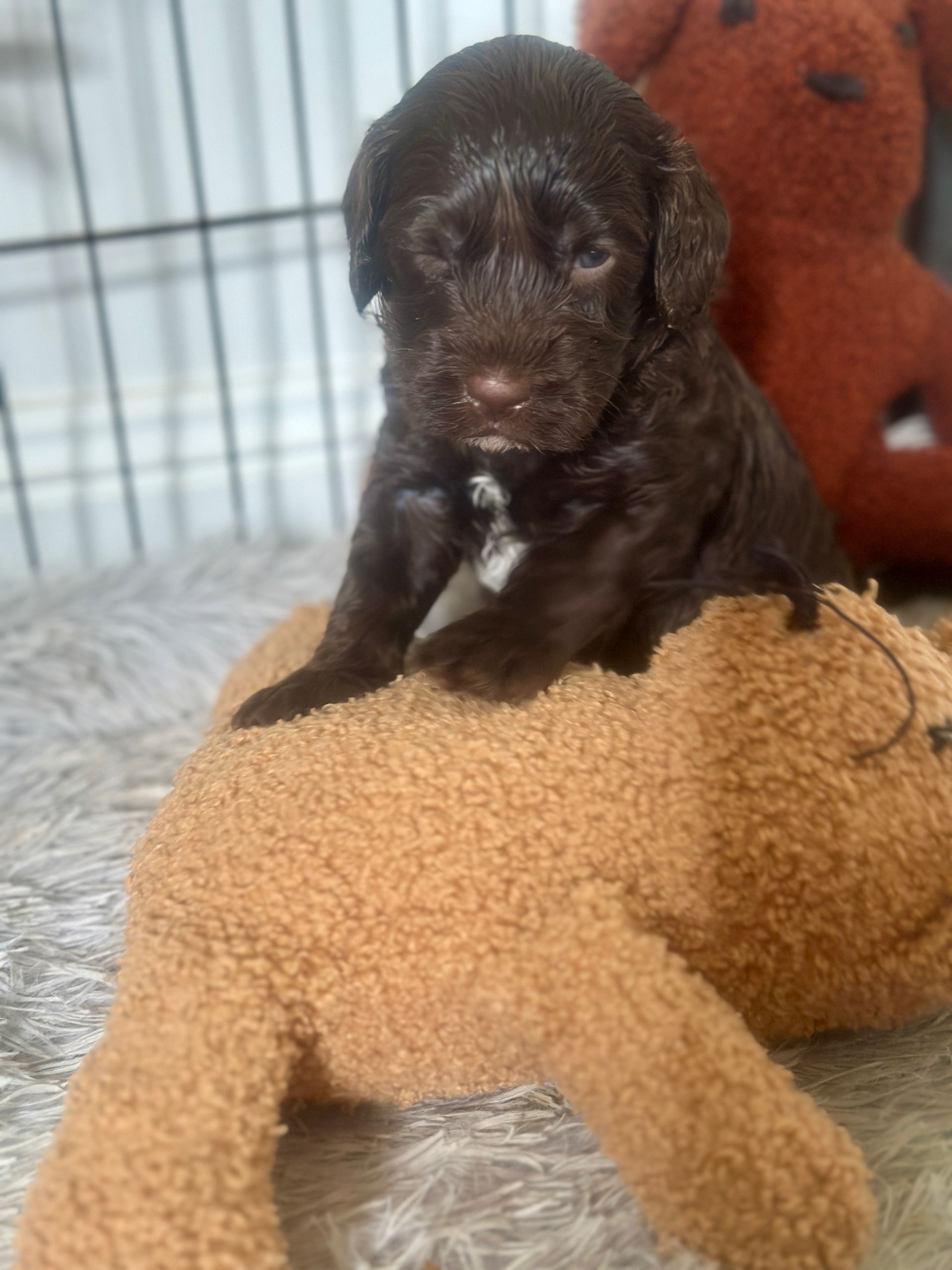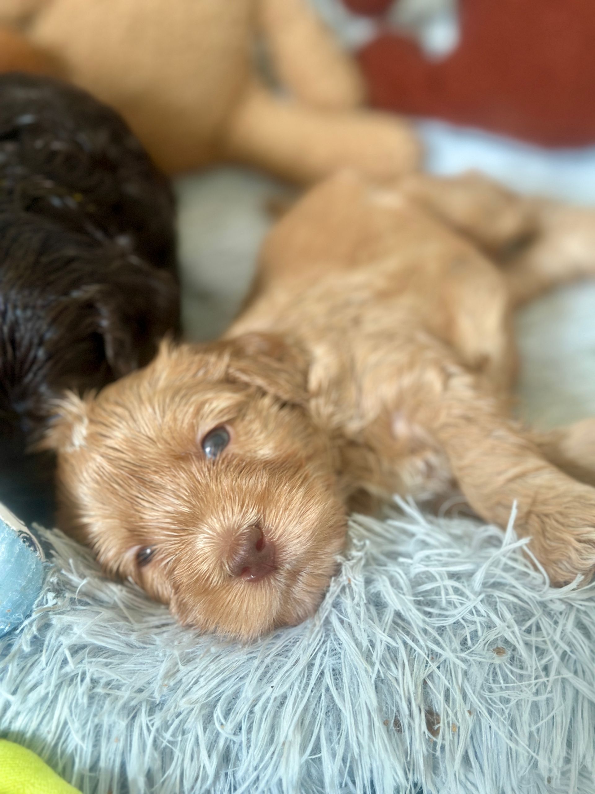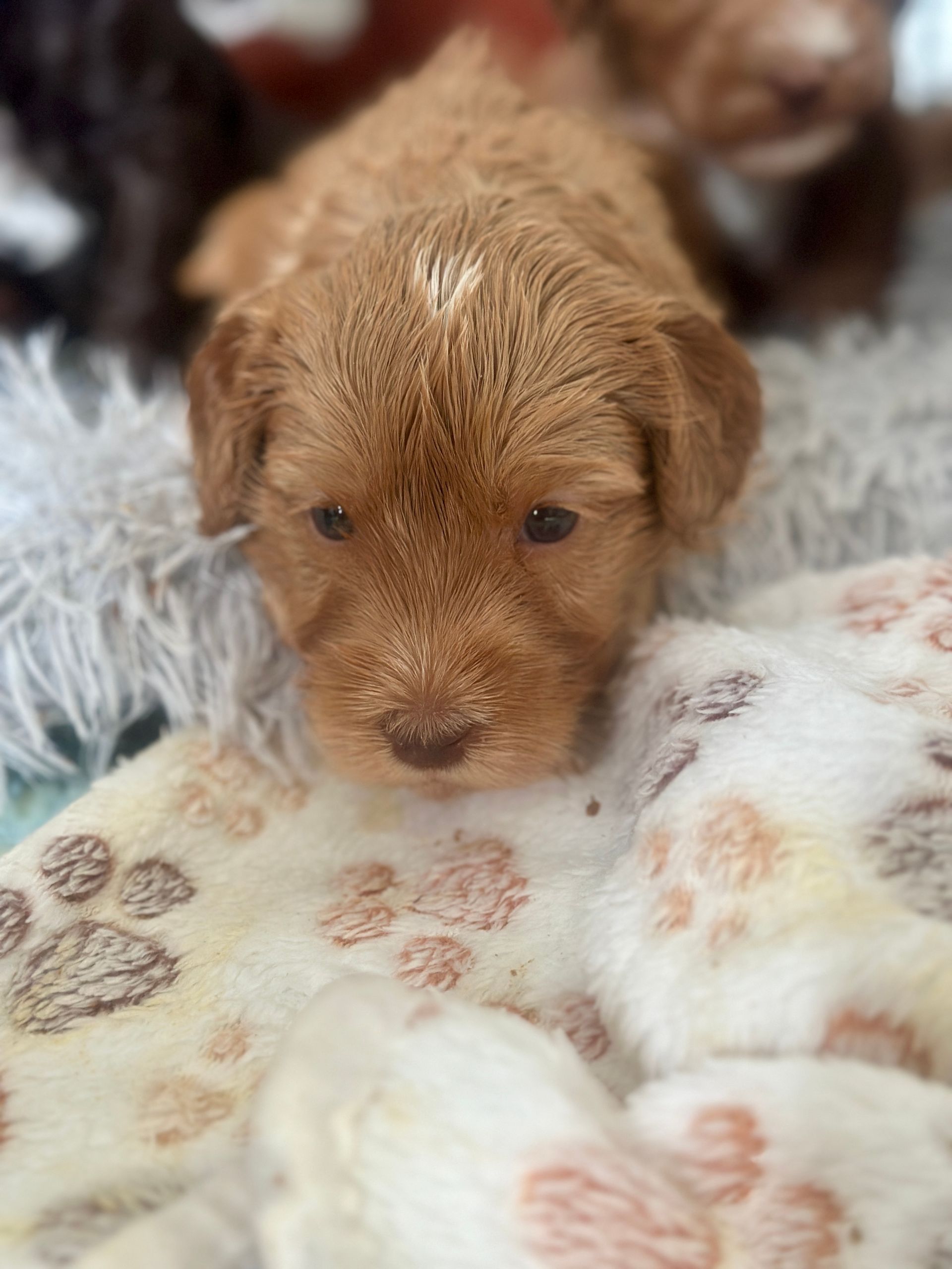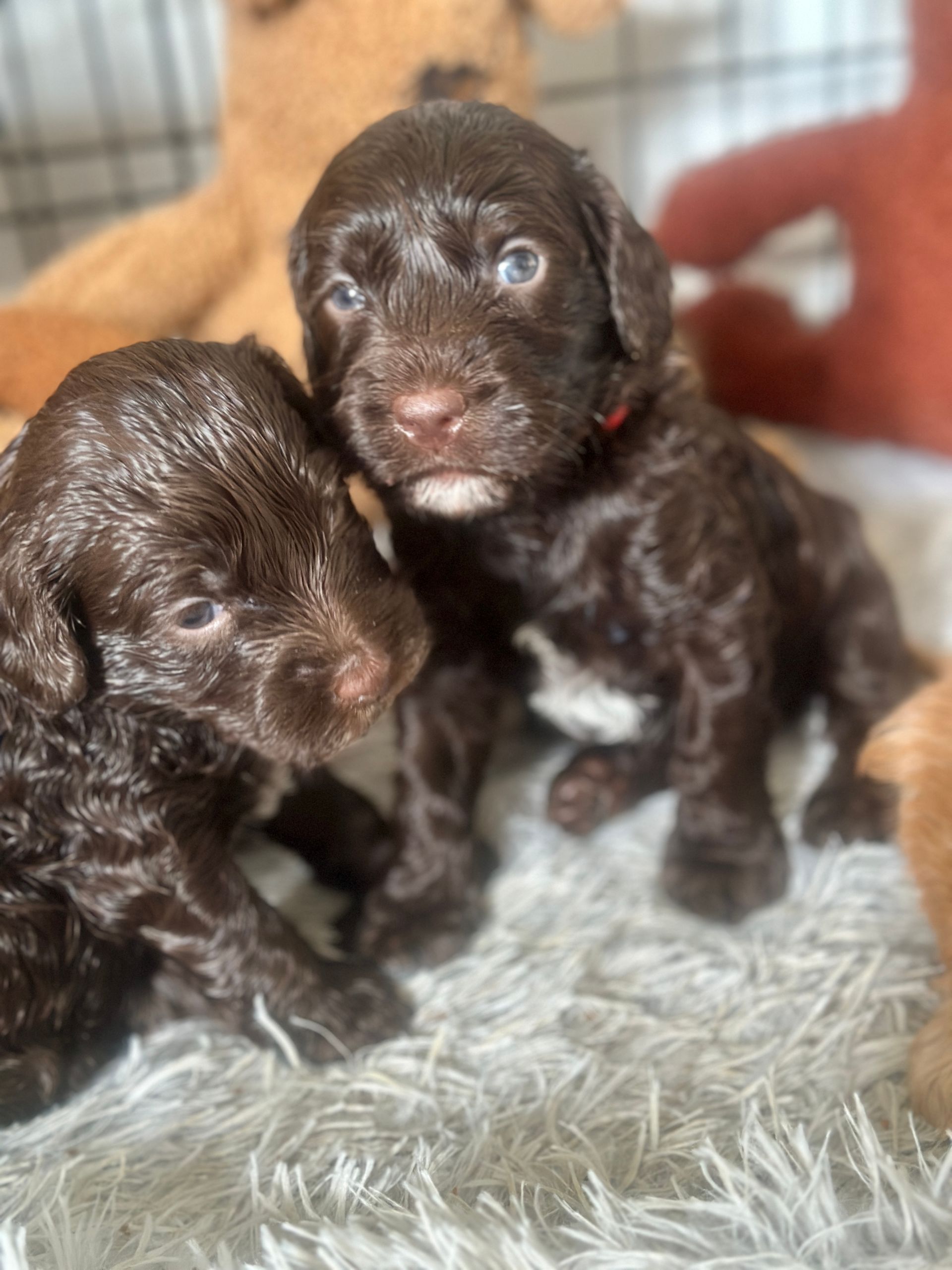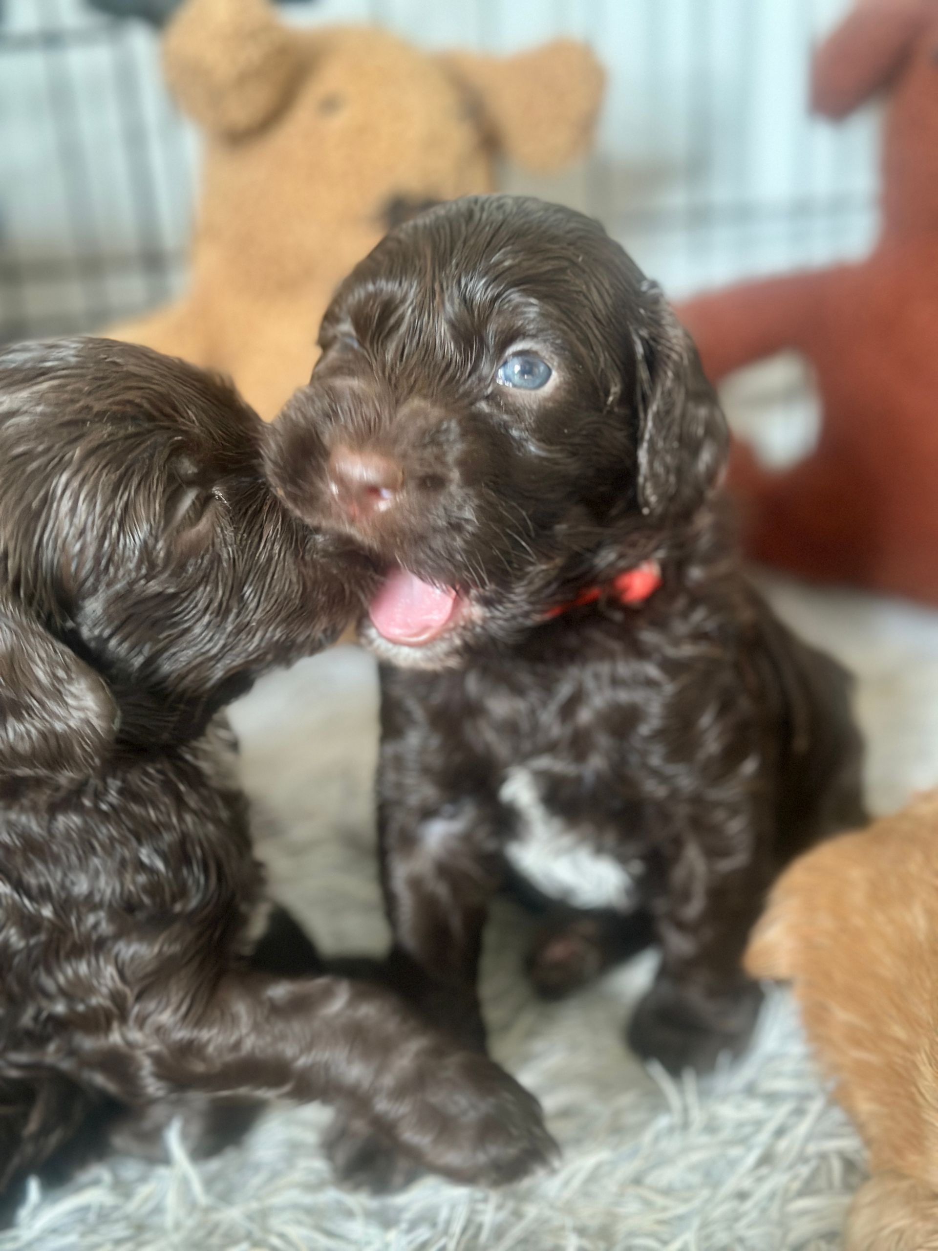 Mummy and babies are doing very well. Pups will be due for new homes around the 30th August We have 1 female and 7 males in chocolate and caramel. Puppies have beautiful soft fleece coats. Both Elise and Max have sound temperaments. We anticipate pups to be around 16 kg as adults dogs.