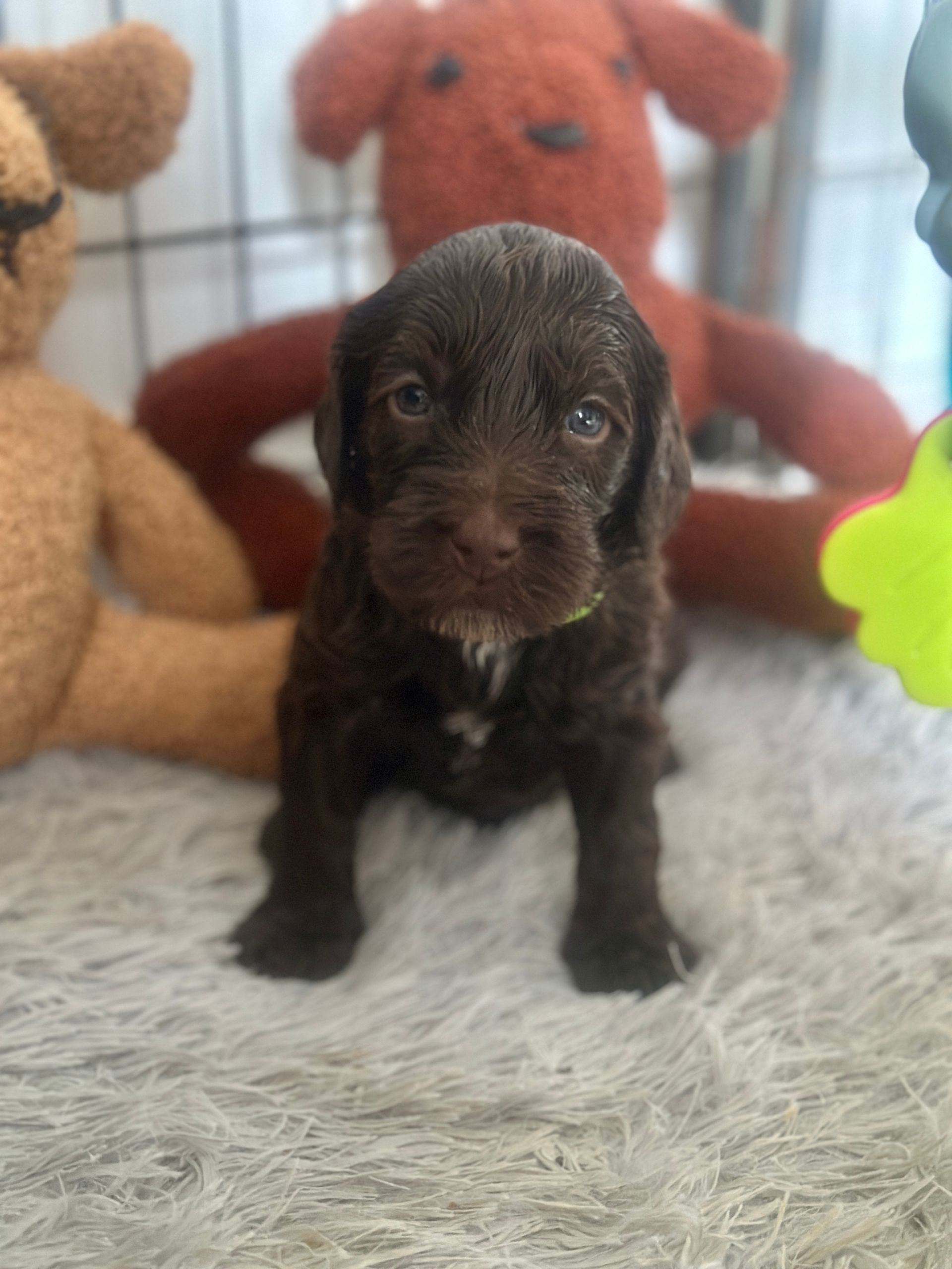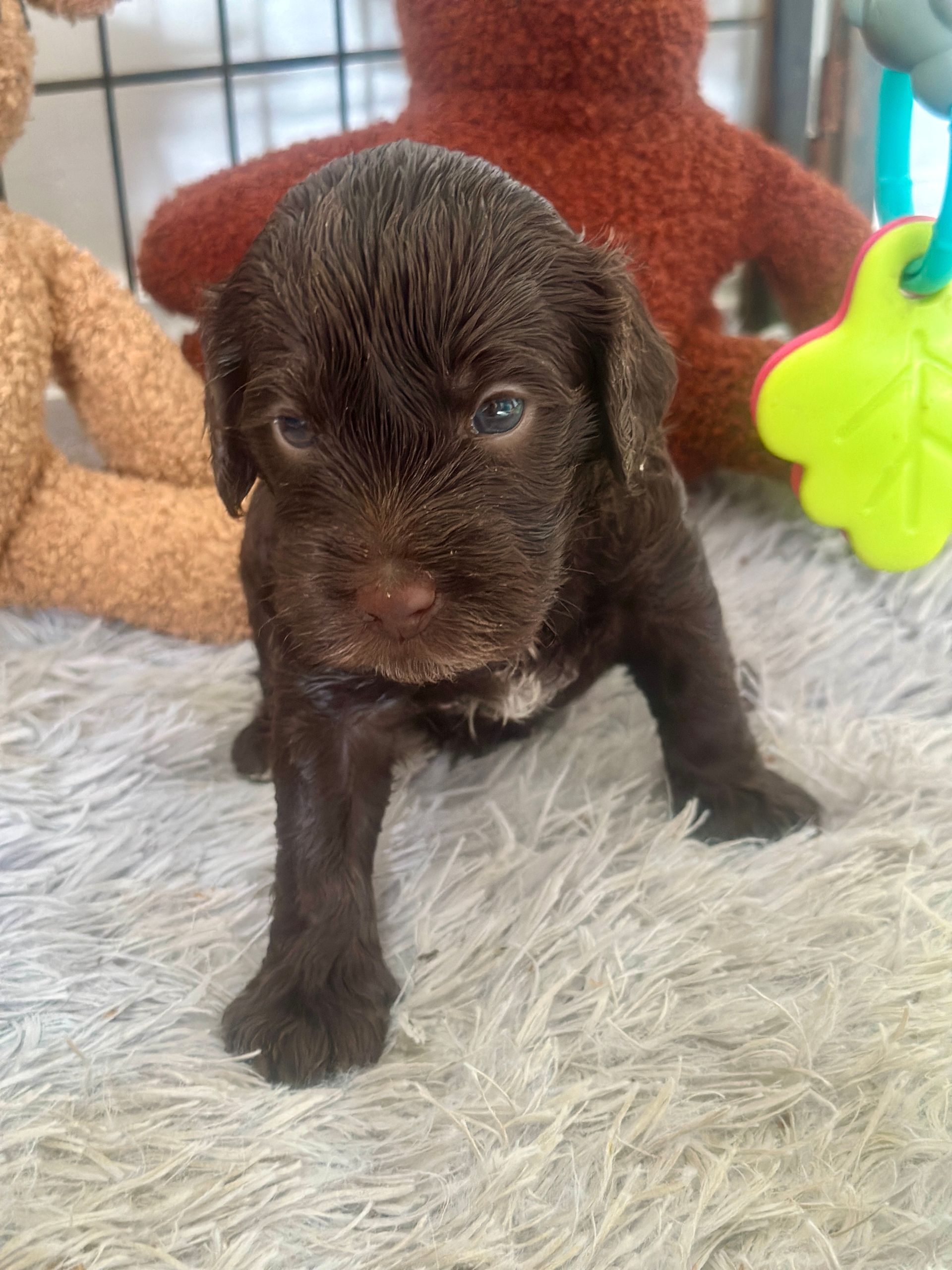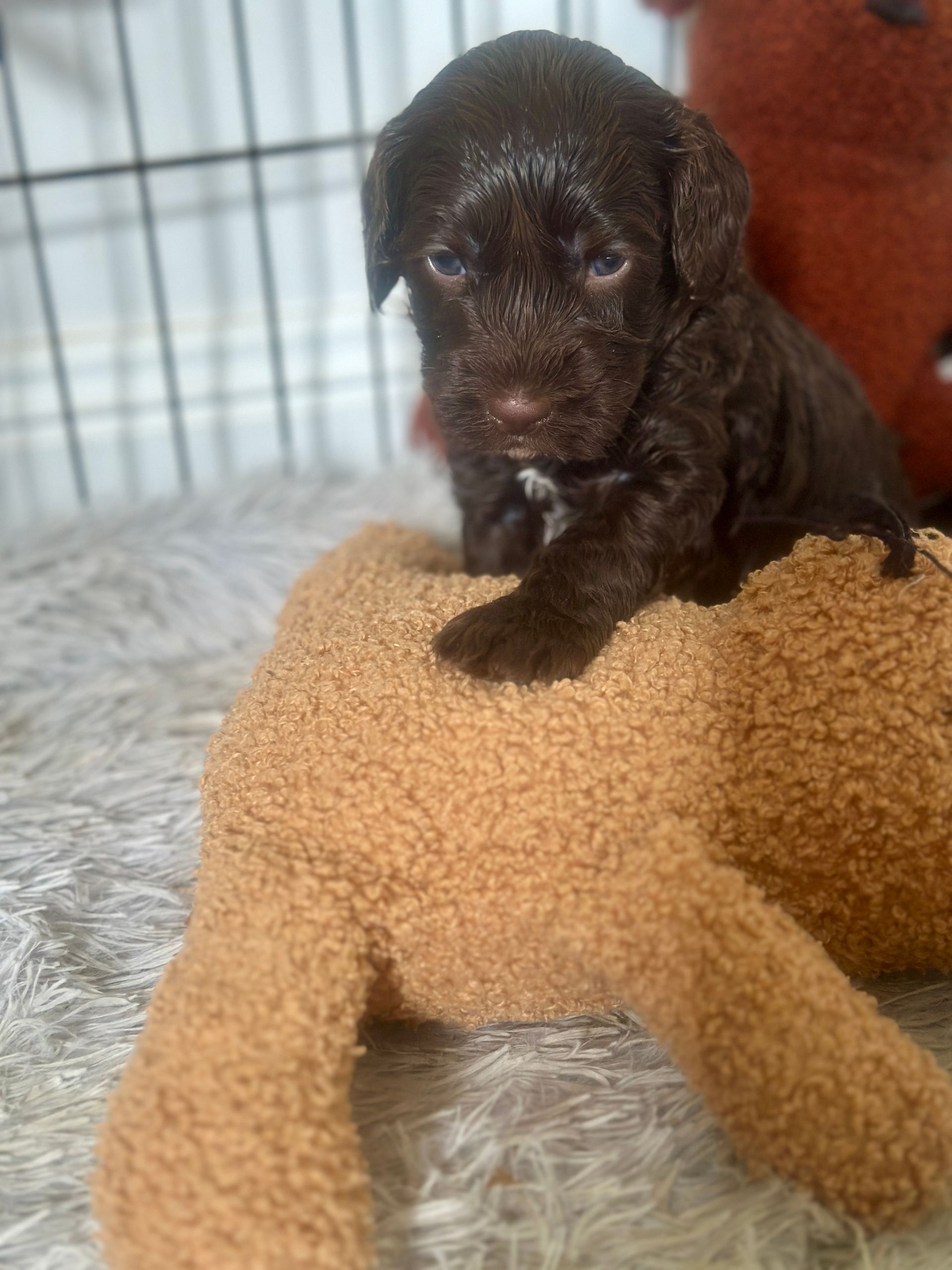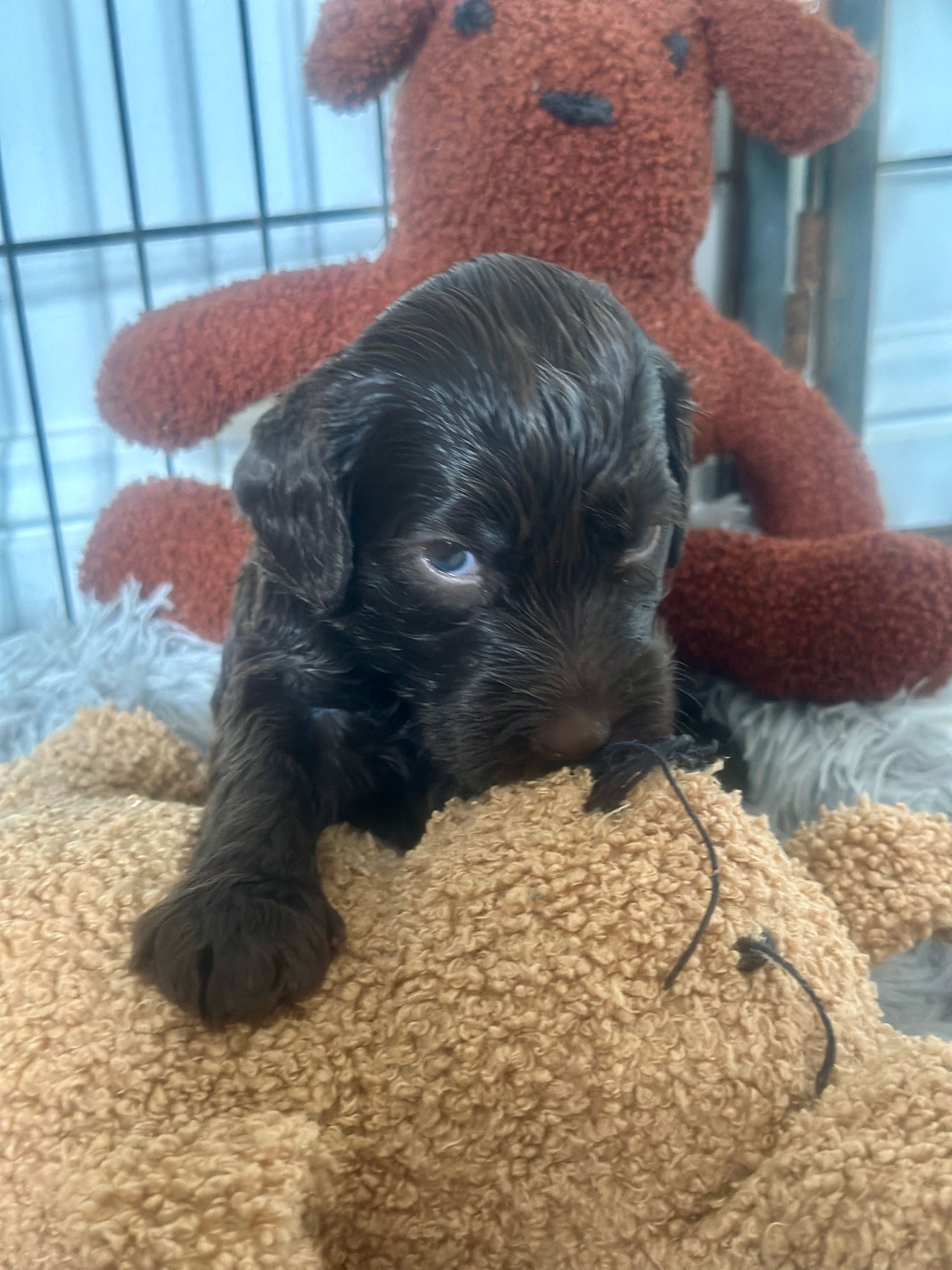 Mummy and babies are doing very well. Pups will be due for new homes around the 30th August We have 1 female and 7 males in chocolate and caramel. Puppies have beautiful soft fleece coats. Both Elise and Max have sound temperaments. We anticipate pups to be around 16 kg as adults dogs.