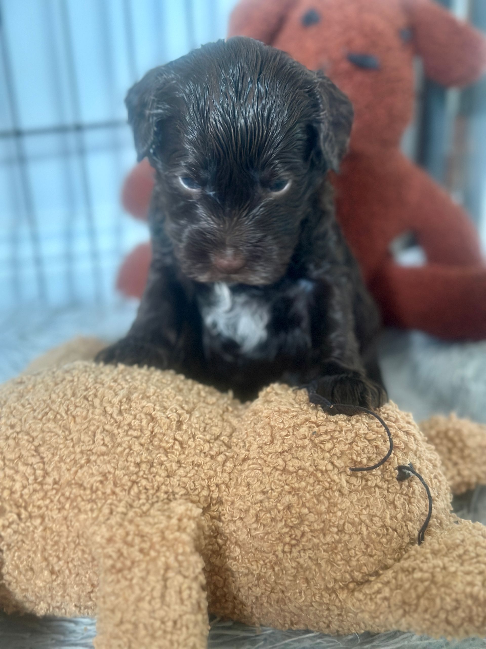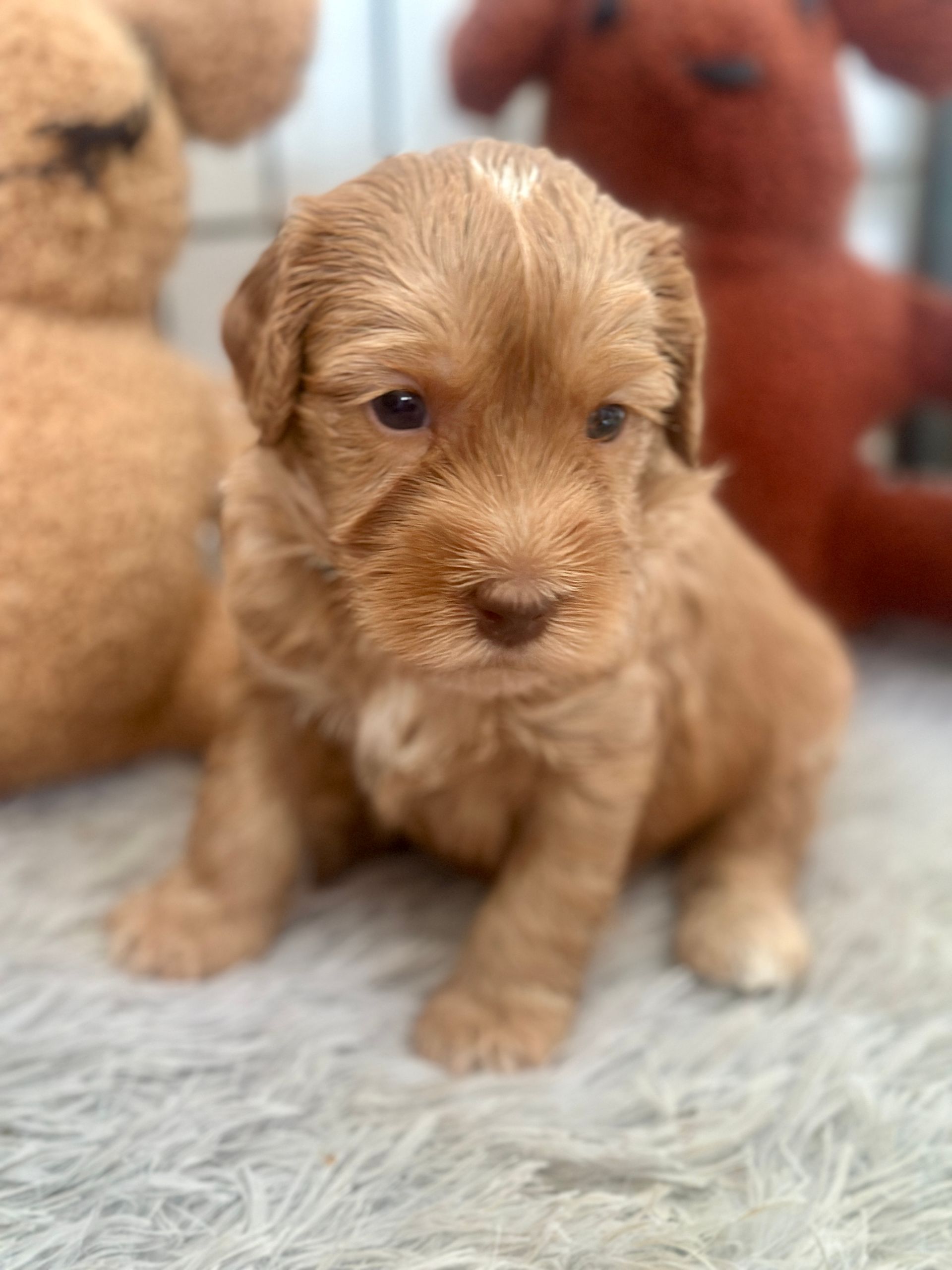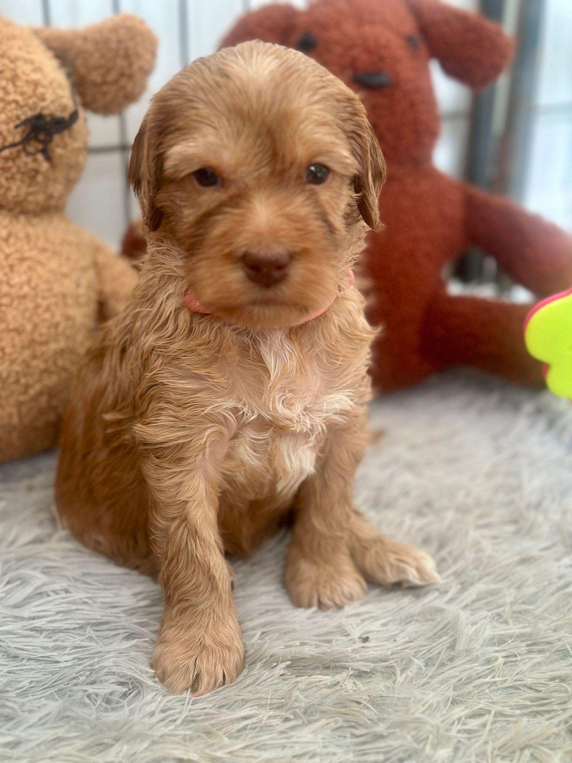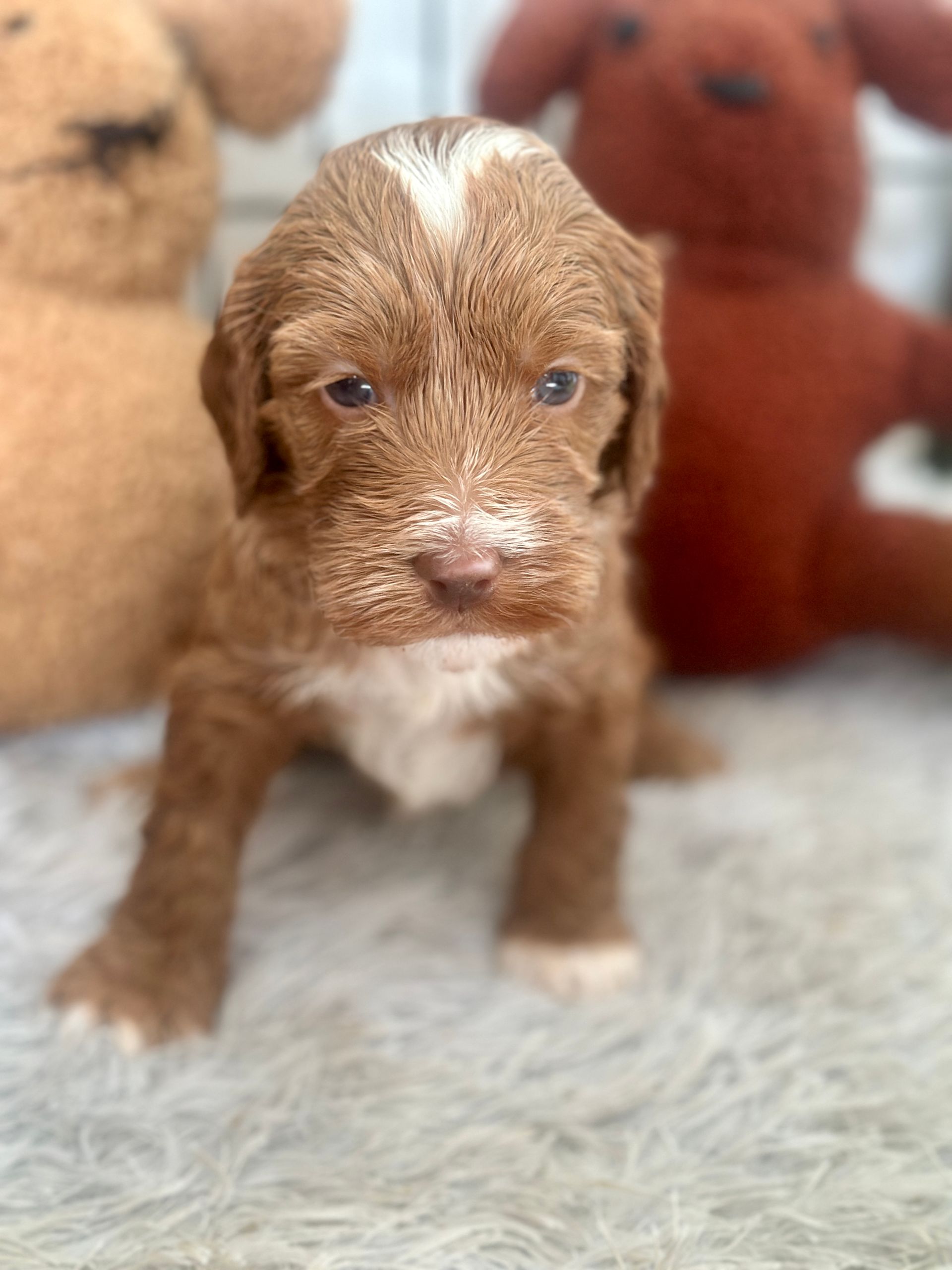 Mummy and babies are doing very well. Pups will be due for new homes around the 30th August We have 1 female and 7 males in chocolate and caramel. Puppies have beautiful soft fleece coats. Both Elise and Max have sound temperaments. We anticipate pups to be around 16 kg as adults dogs.