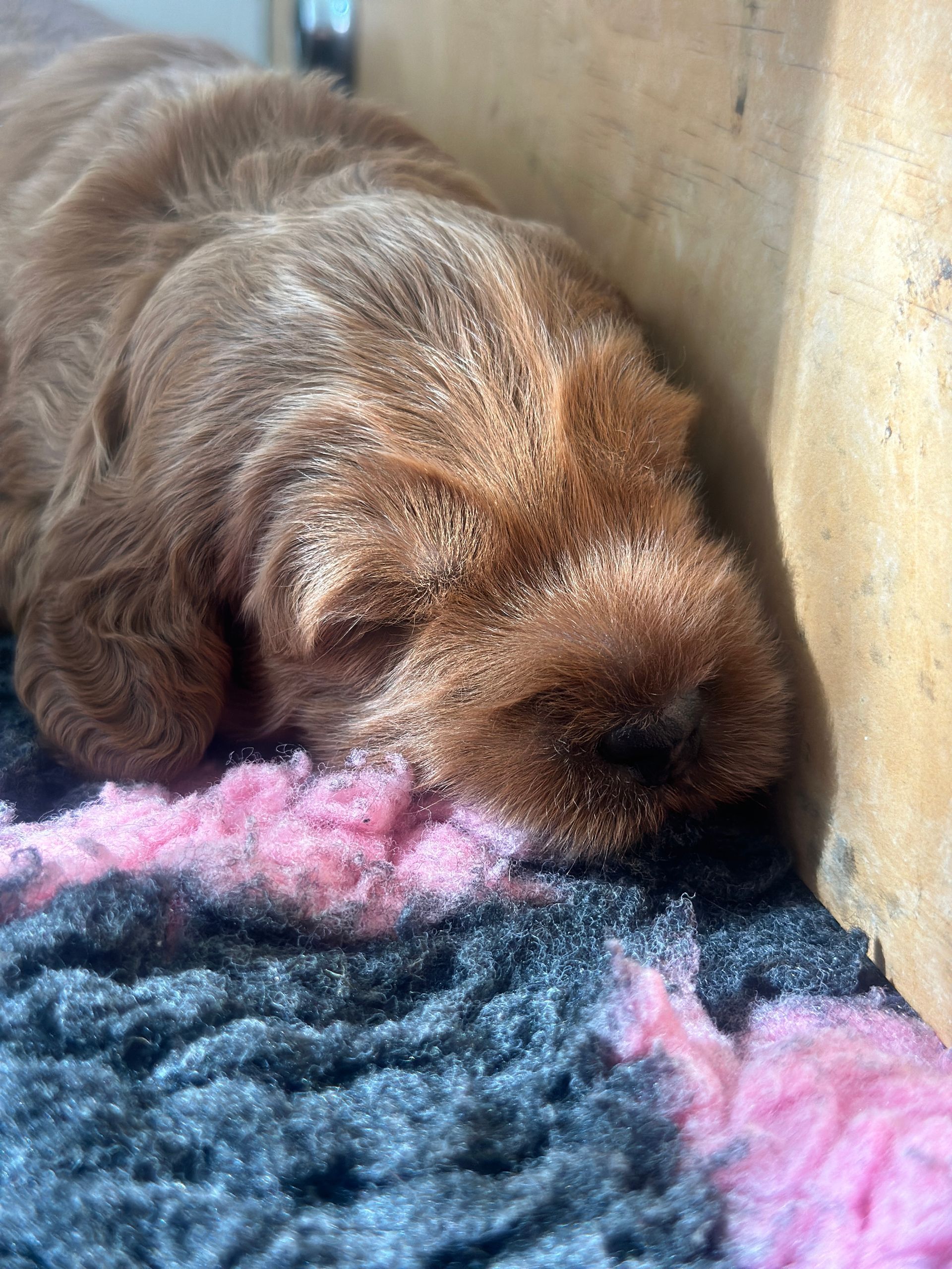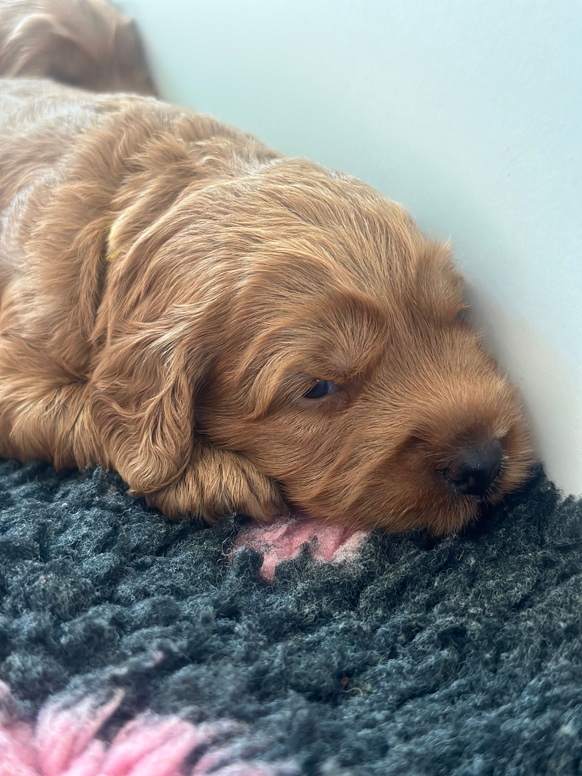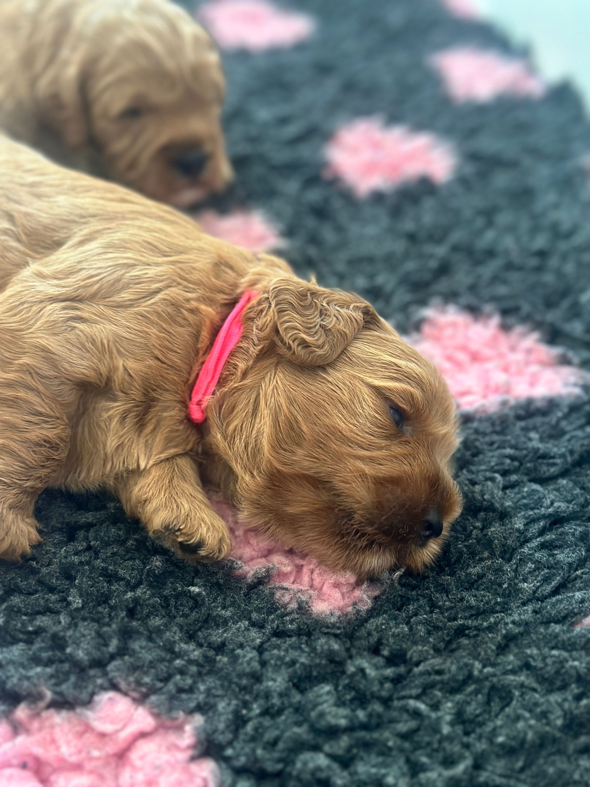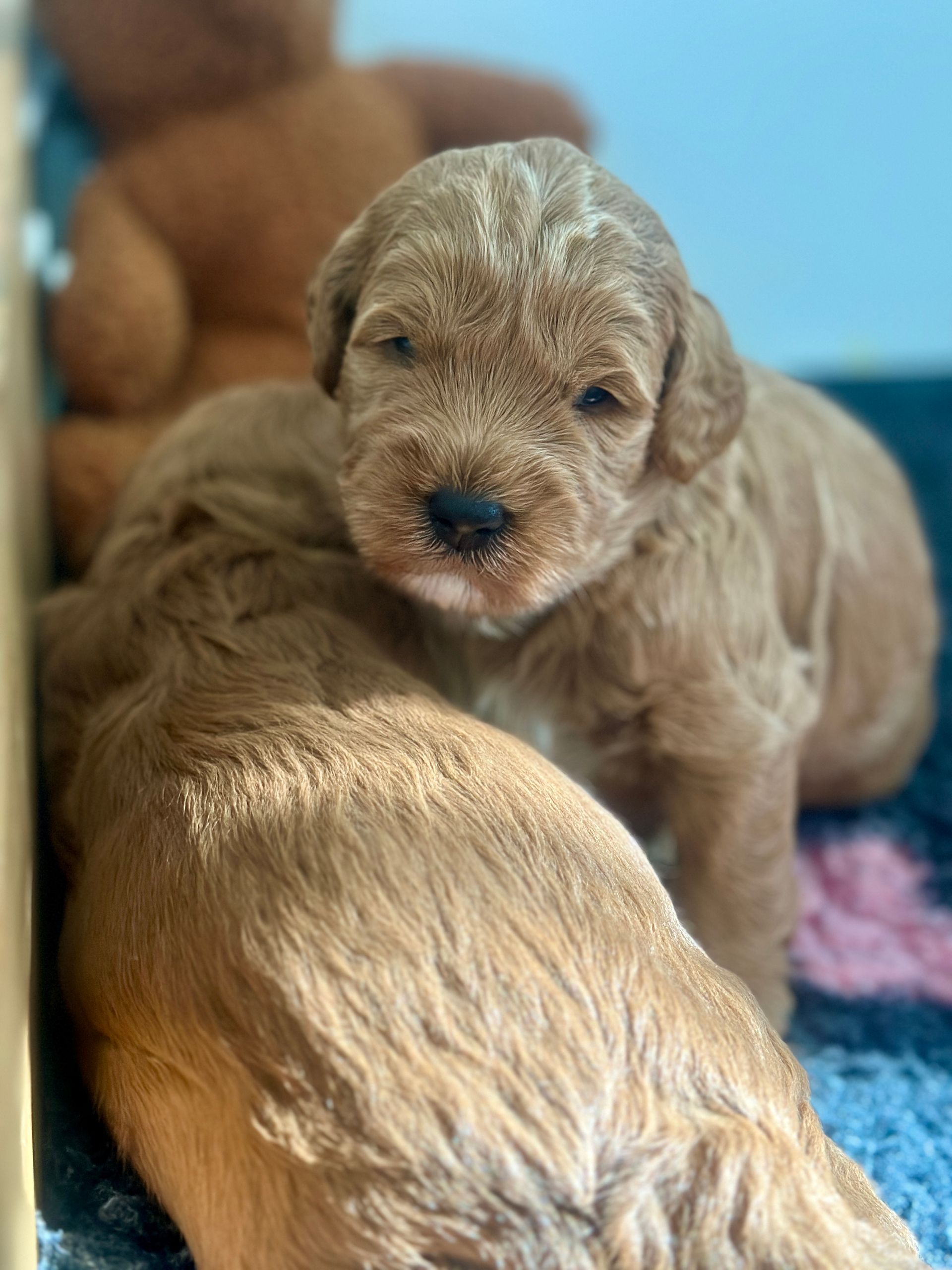 Mummy and babies are doing very well. Pups will be due for new homes around the 12th/13th December. We have caramel and creme caramel. We anticipate pups to be around 12 kg as adults dogs. All pups from this litter have loving homes to go to.