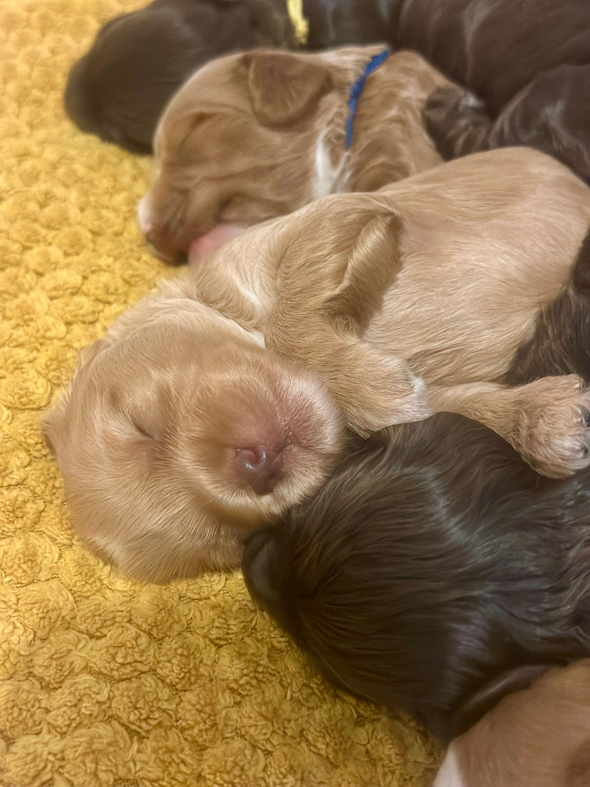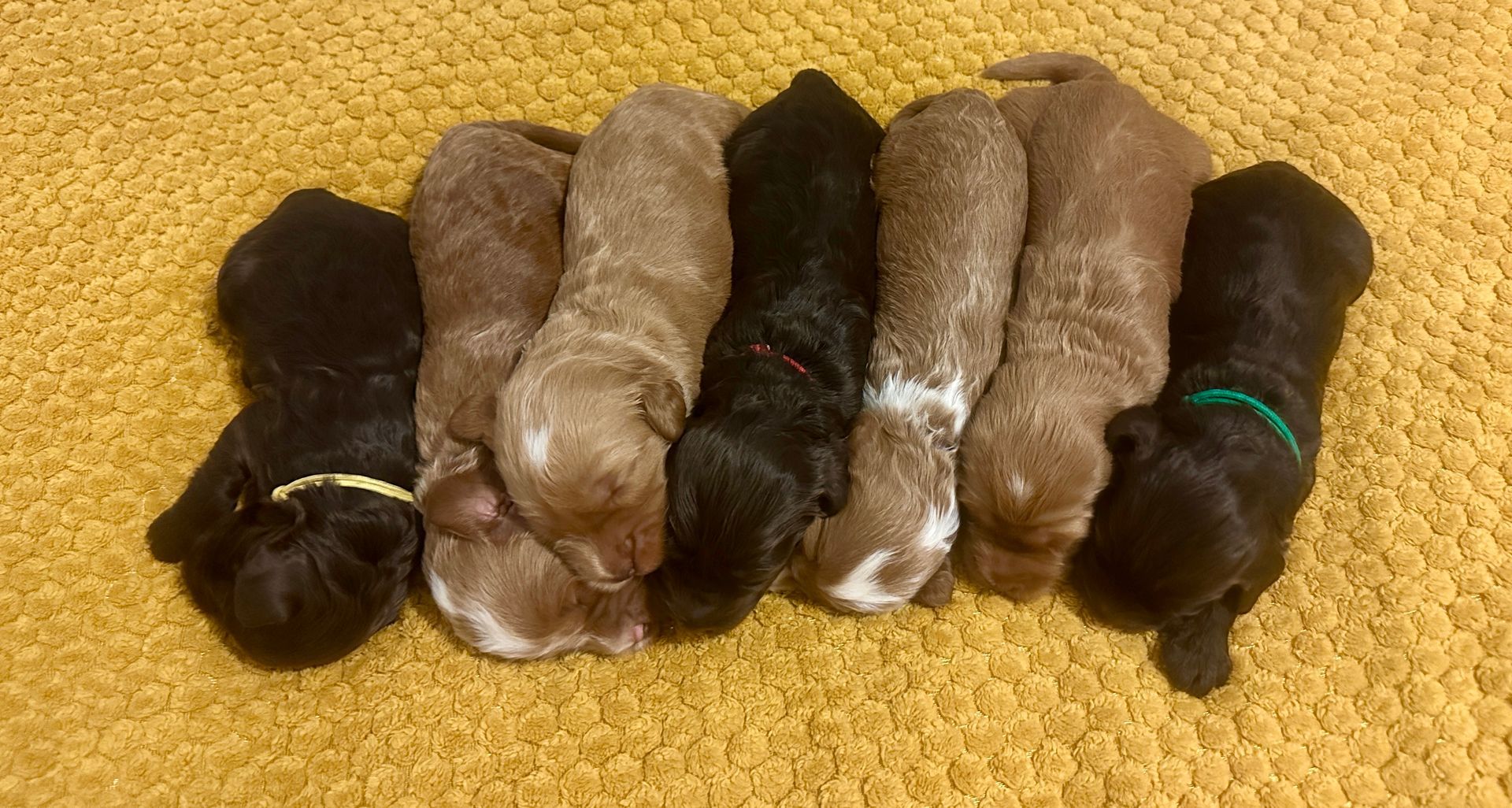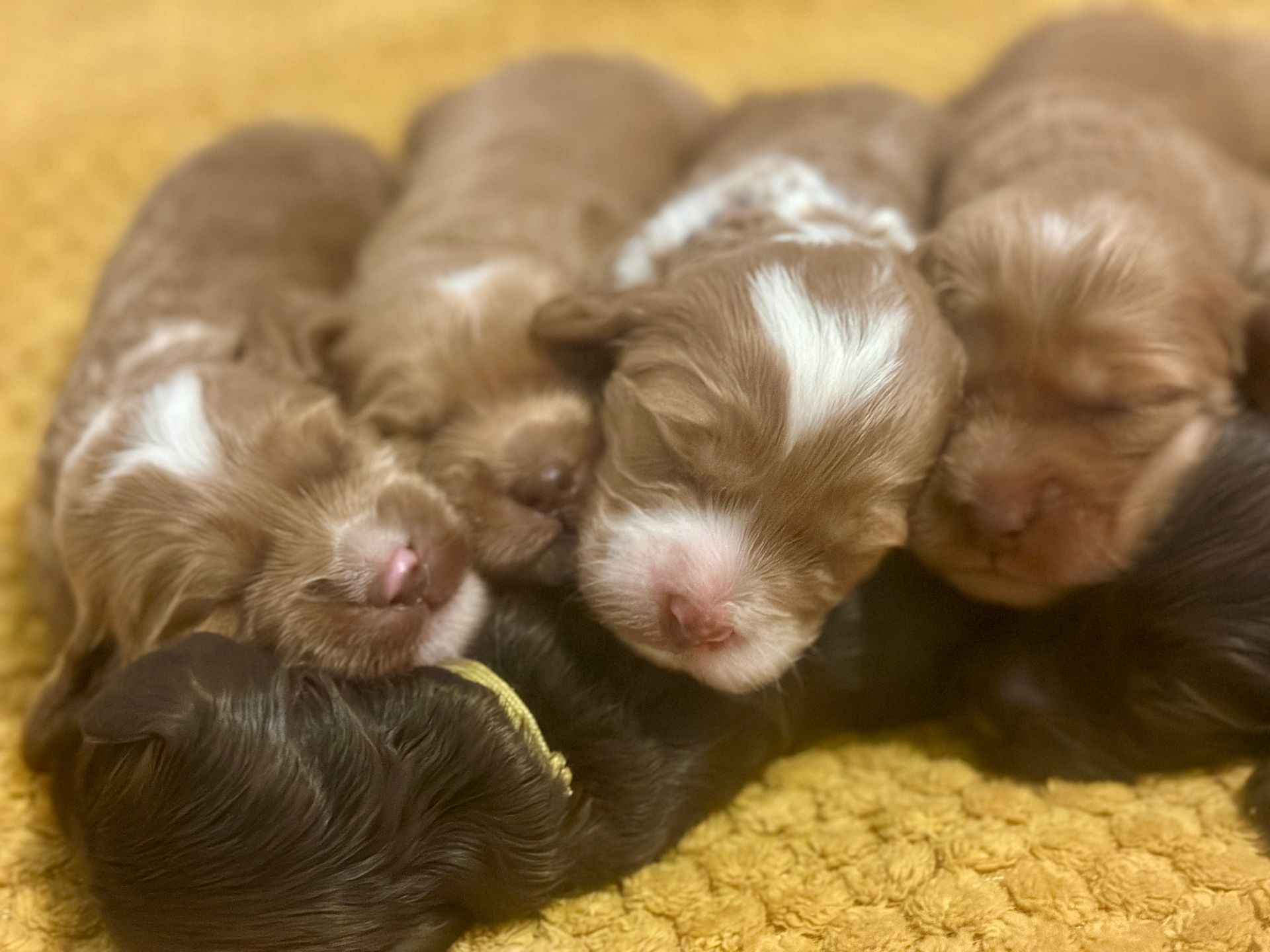 Mummy and babies are doing very well. Pups will be due for new homes around the 30th August We have 1 female and 7 males in chocolate and caramel. Puppies have beautiful soft fleece coats. Both Elise and Max have sound temperaments. We anticipate pups to be around 16 kg as adults dogs. Due to a change in circumstances, we have one pup available from this litter. If you are interested, please complete an Expression of Interest or call Trish on 0409 813 053