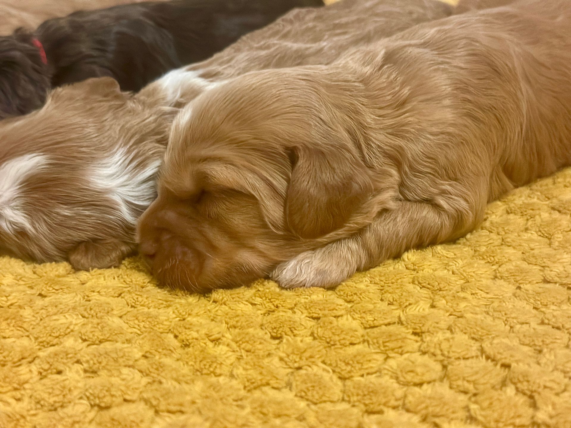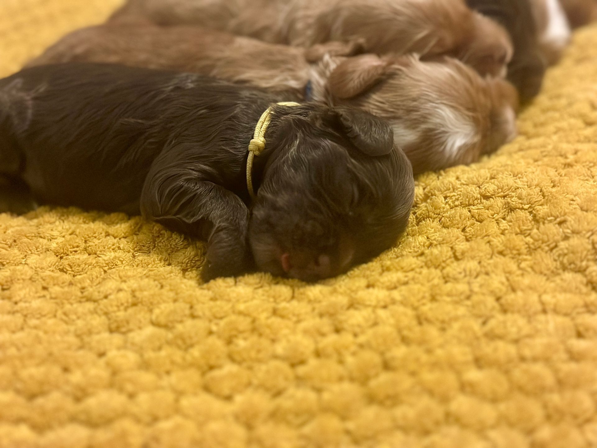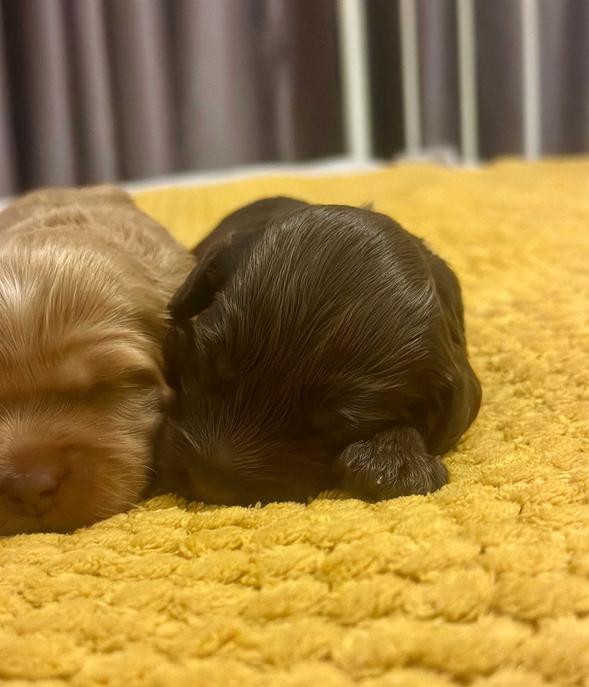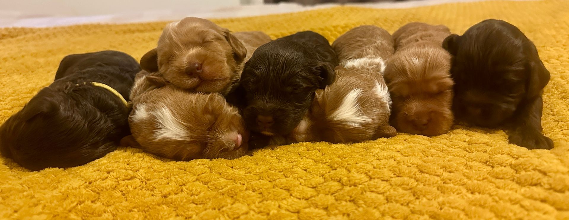 Mummy and babies are doing very well. Pups will be due for new homes around the 30th August We have 1 female and 7 males in chocolate and caramel. Puppies have beautiful soft fleece coats. Both Elise and Max have sound temperaments. We anticipate pups to be around 16 kg as adults dogs. Due to a change in circumstances, we have one pup available from this litter. If you are interested, please complete an Expression of Interest or call Trish on 0409 813 053