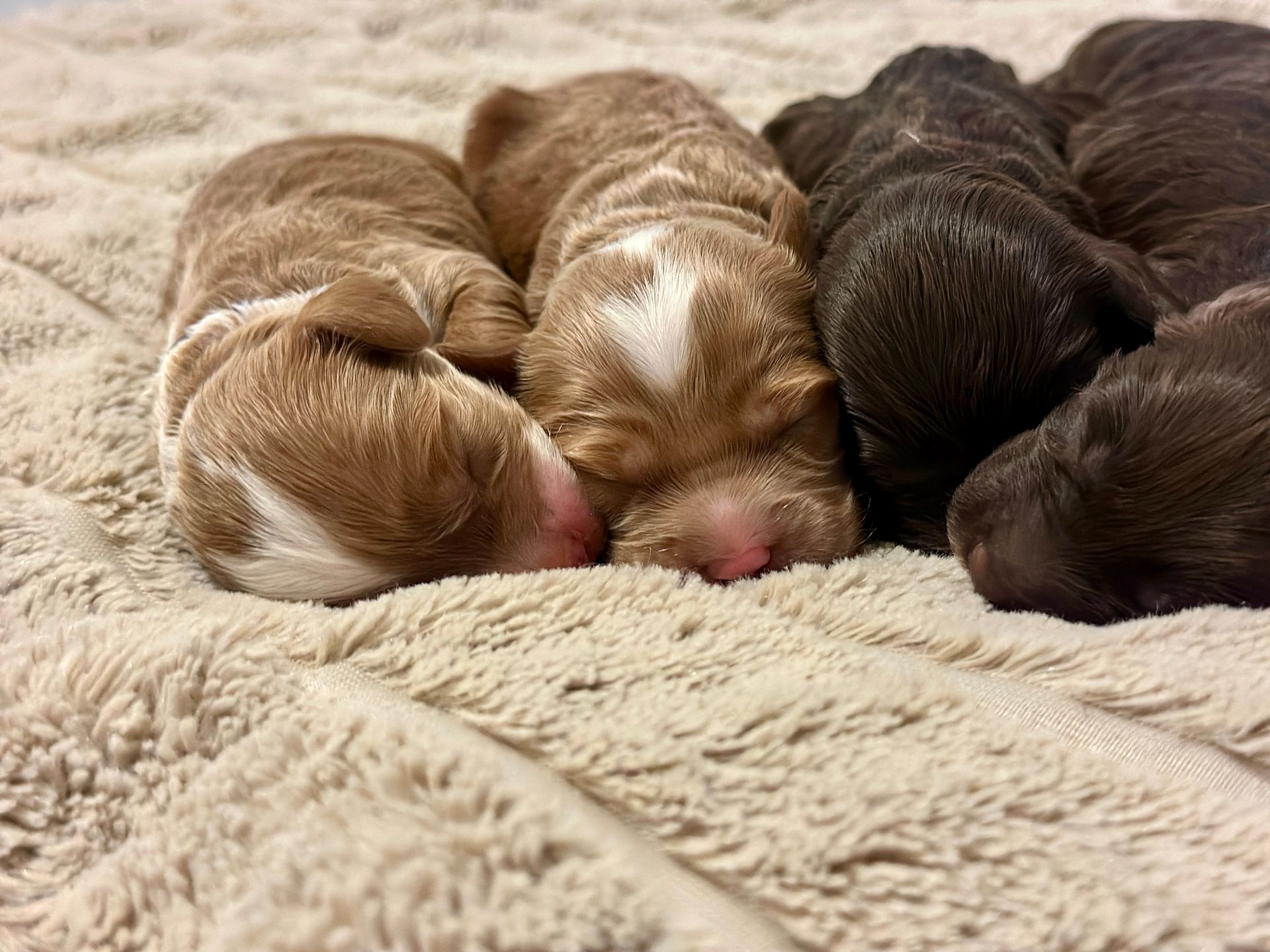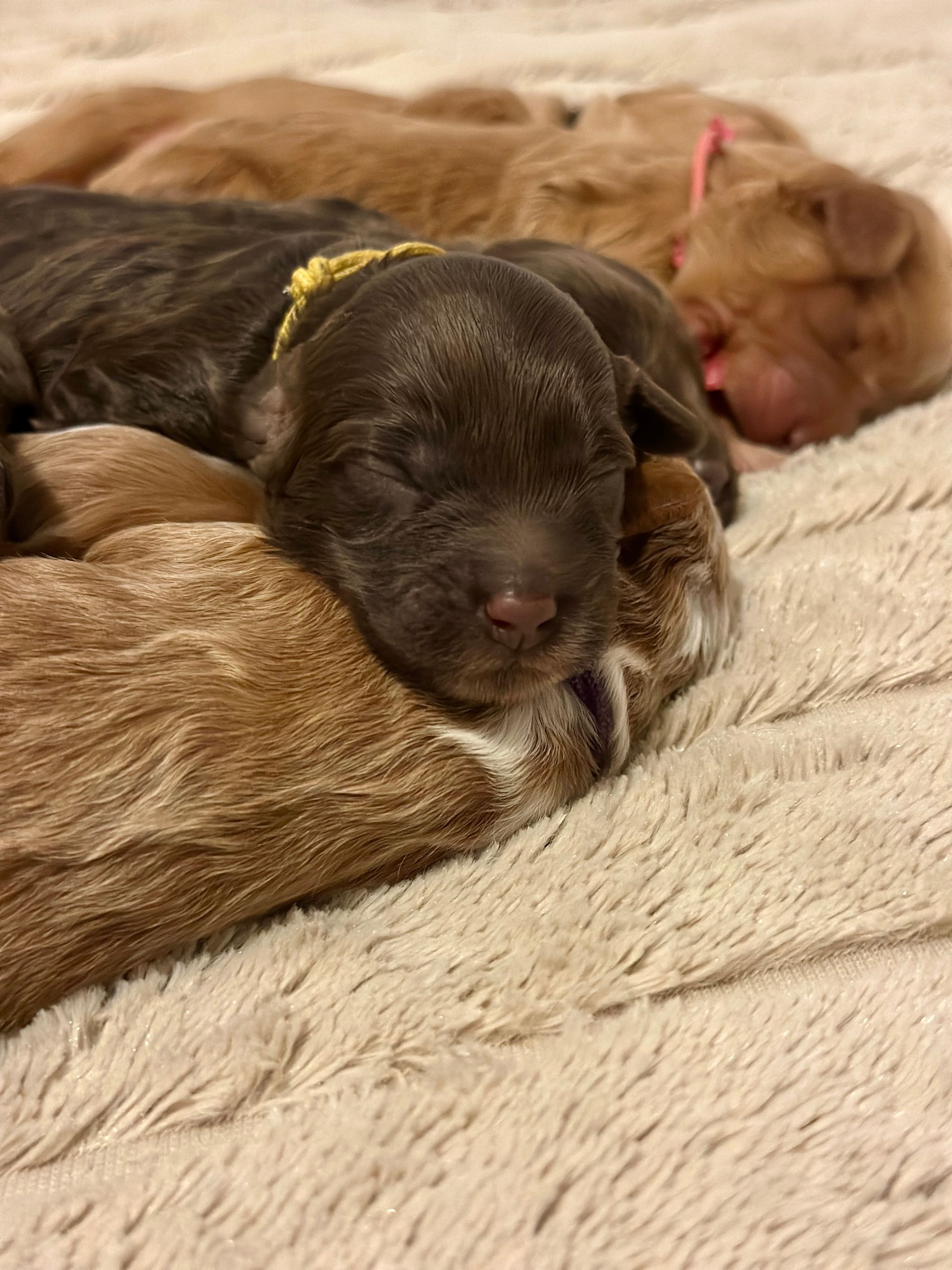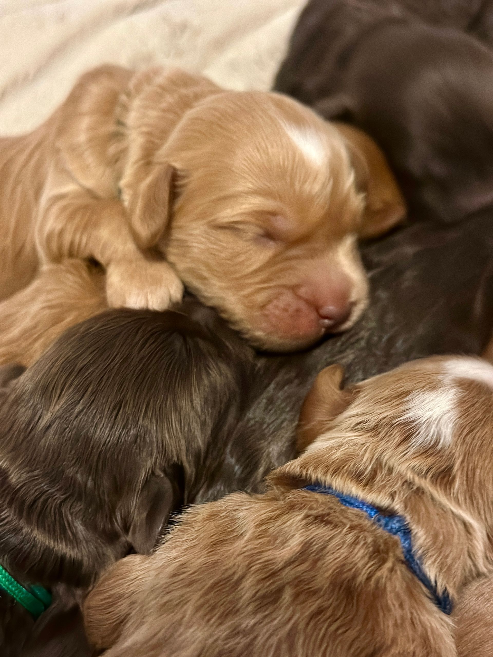 Mummy and babies are doing very well. Pups will be due for new homes around the 30th August 2025. We have 1 female and 6 males in chocolate, caramel and caramel and white mismatch We anticipate pups to be around 14-16 kg as adults dogs.