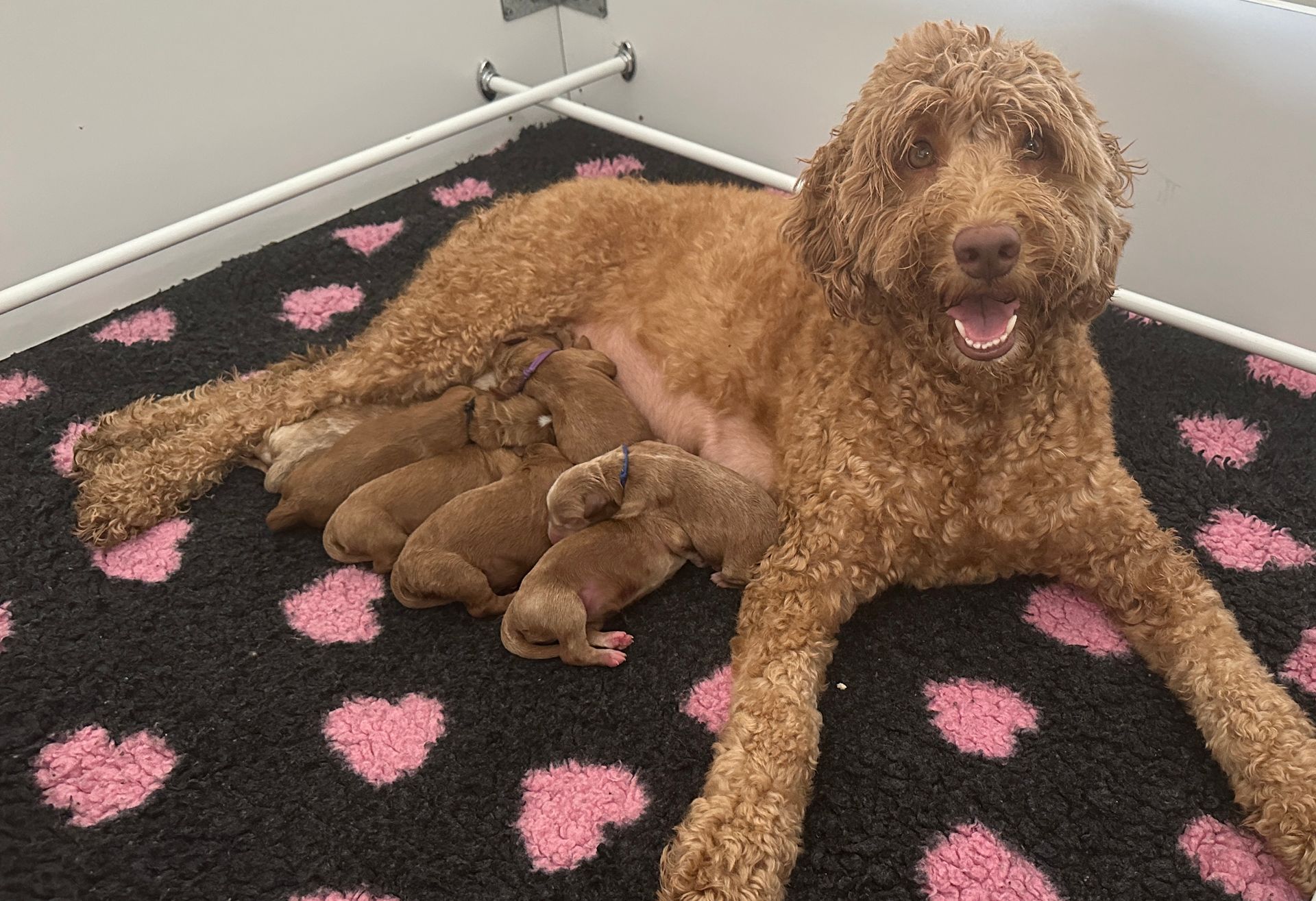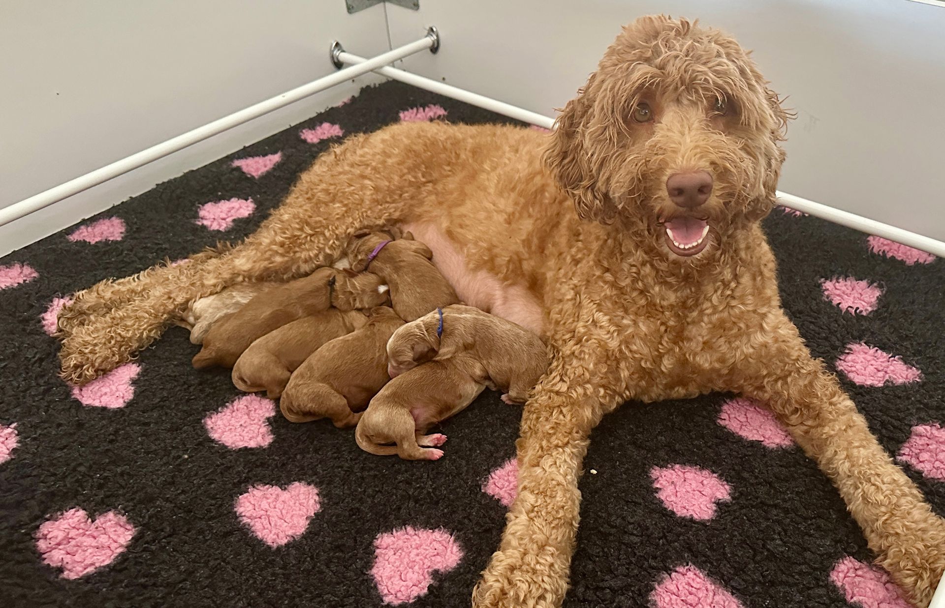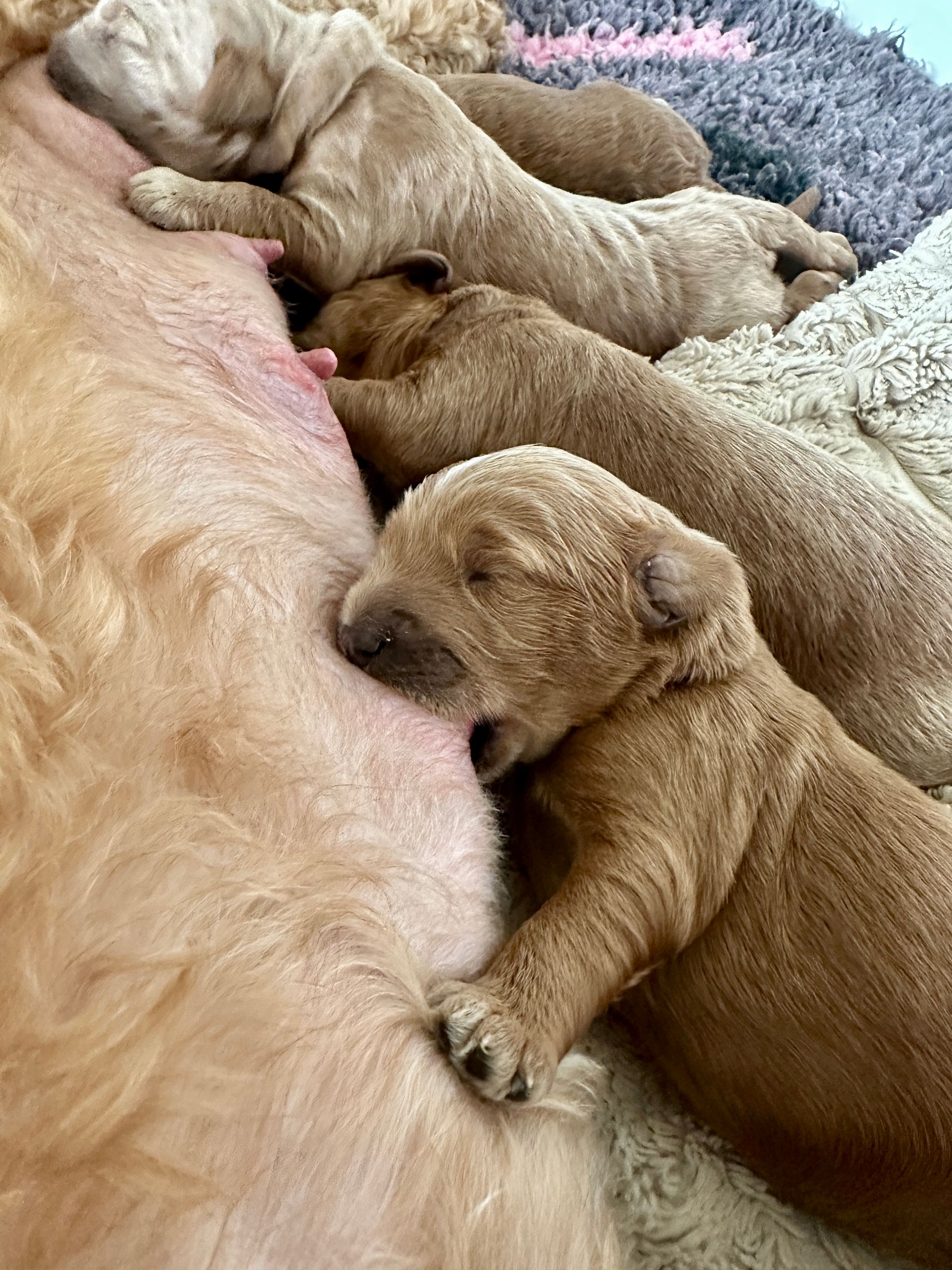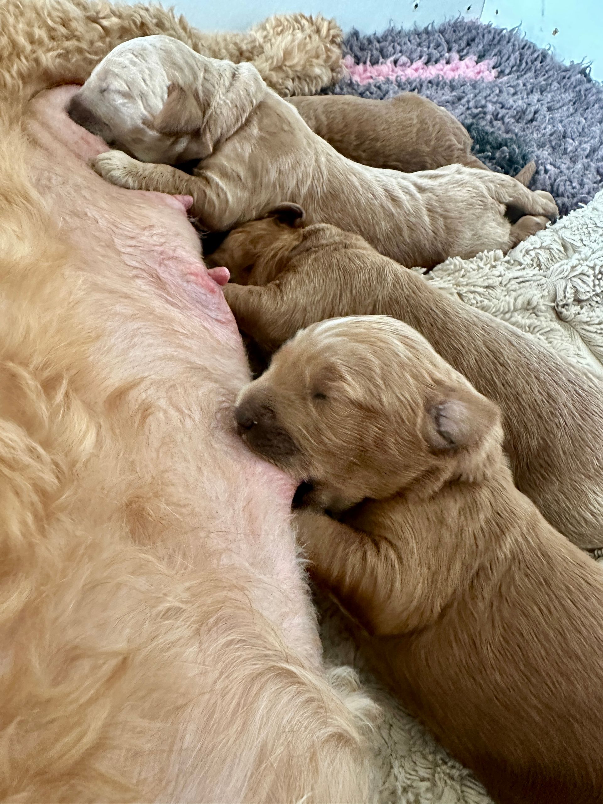 Mummy and babies are doing very well. We have five males and two females in caramel colourings We anticipate pups to be around 14 -16kg kg as adults dogs. Pups will be ready for their new homes around the 11th and 12th of October. All pups from this litter have loving homes to go to.